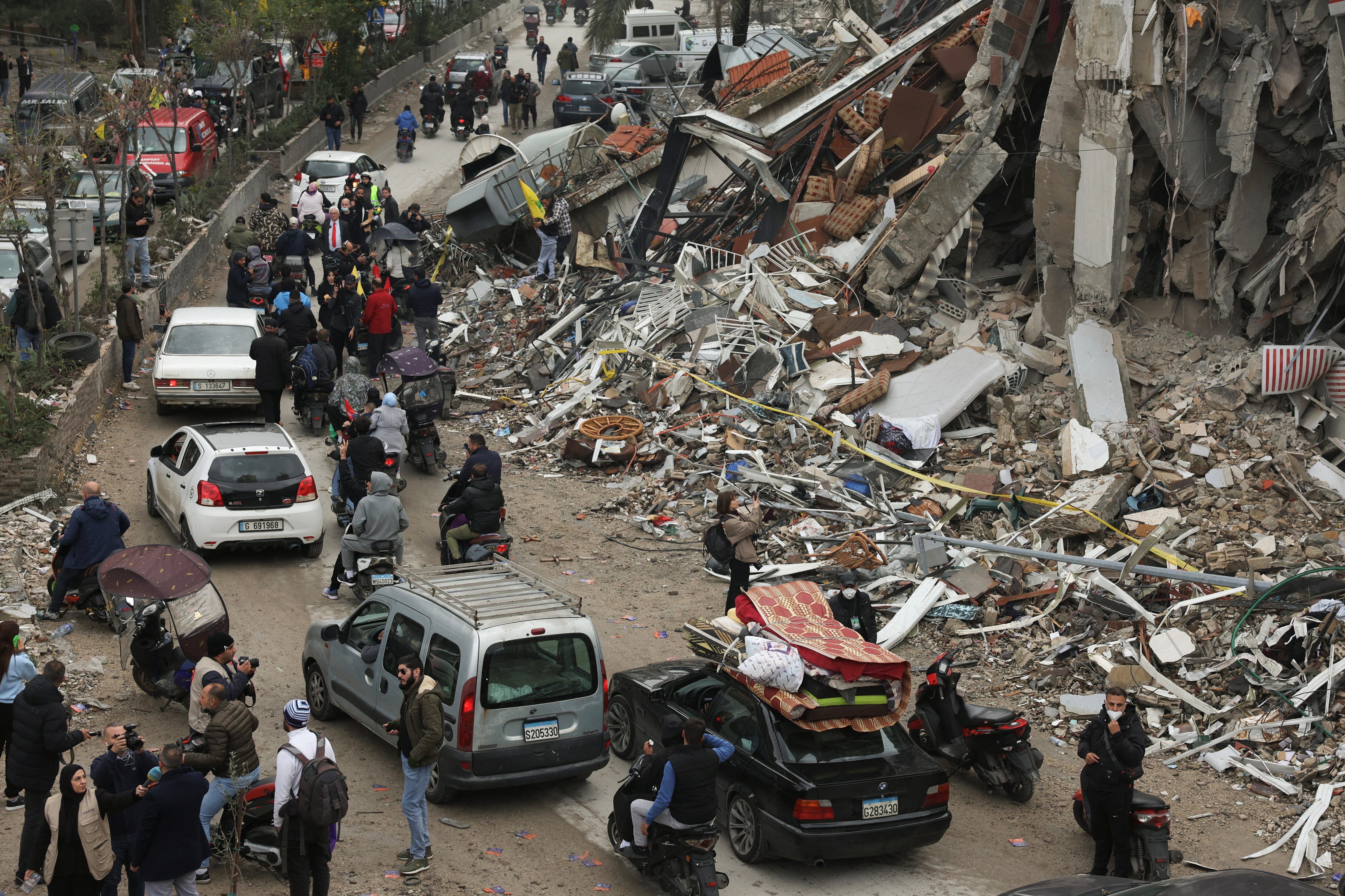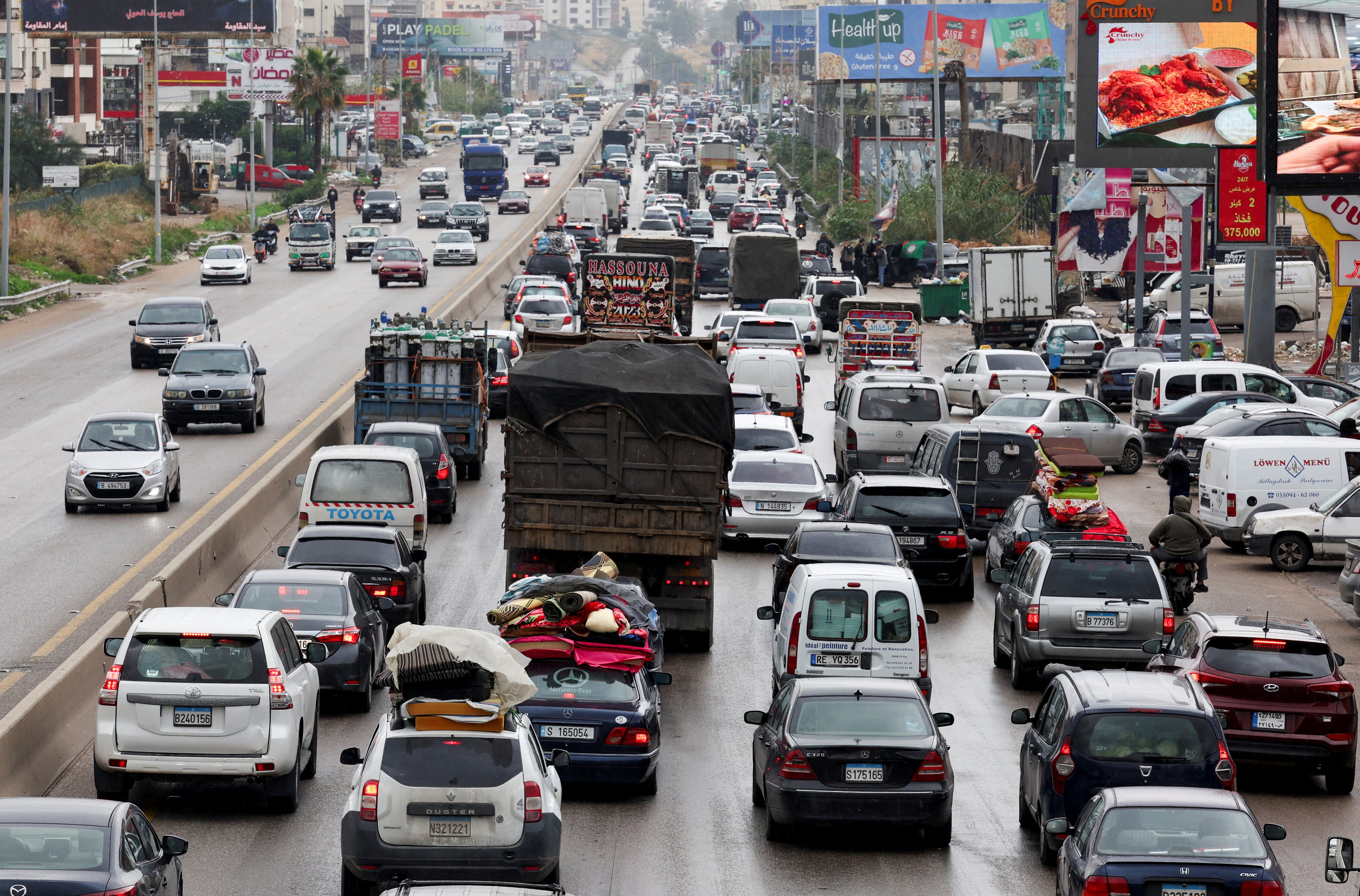 装满床垫、行李甚至家具的汽车和面包车穿过在停火前几天遭到猛烈轰炸的港口城市提尔,驶向南方。过去两个月,战斗加剧,迫使数十万黎巴嫩人离开家园。