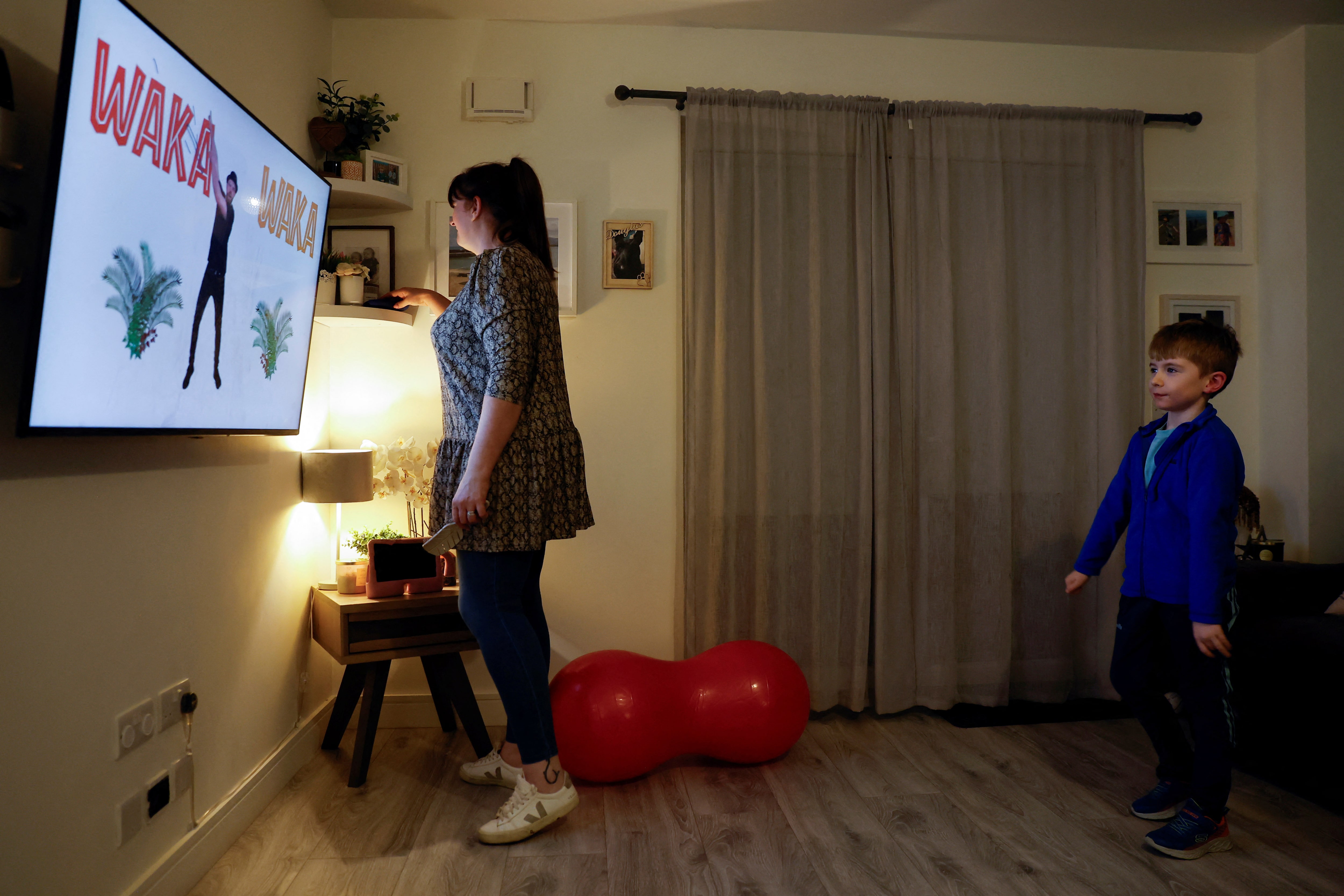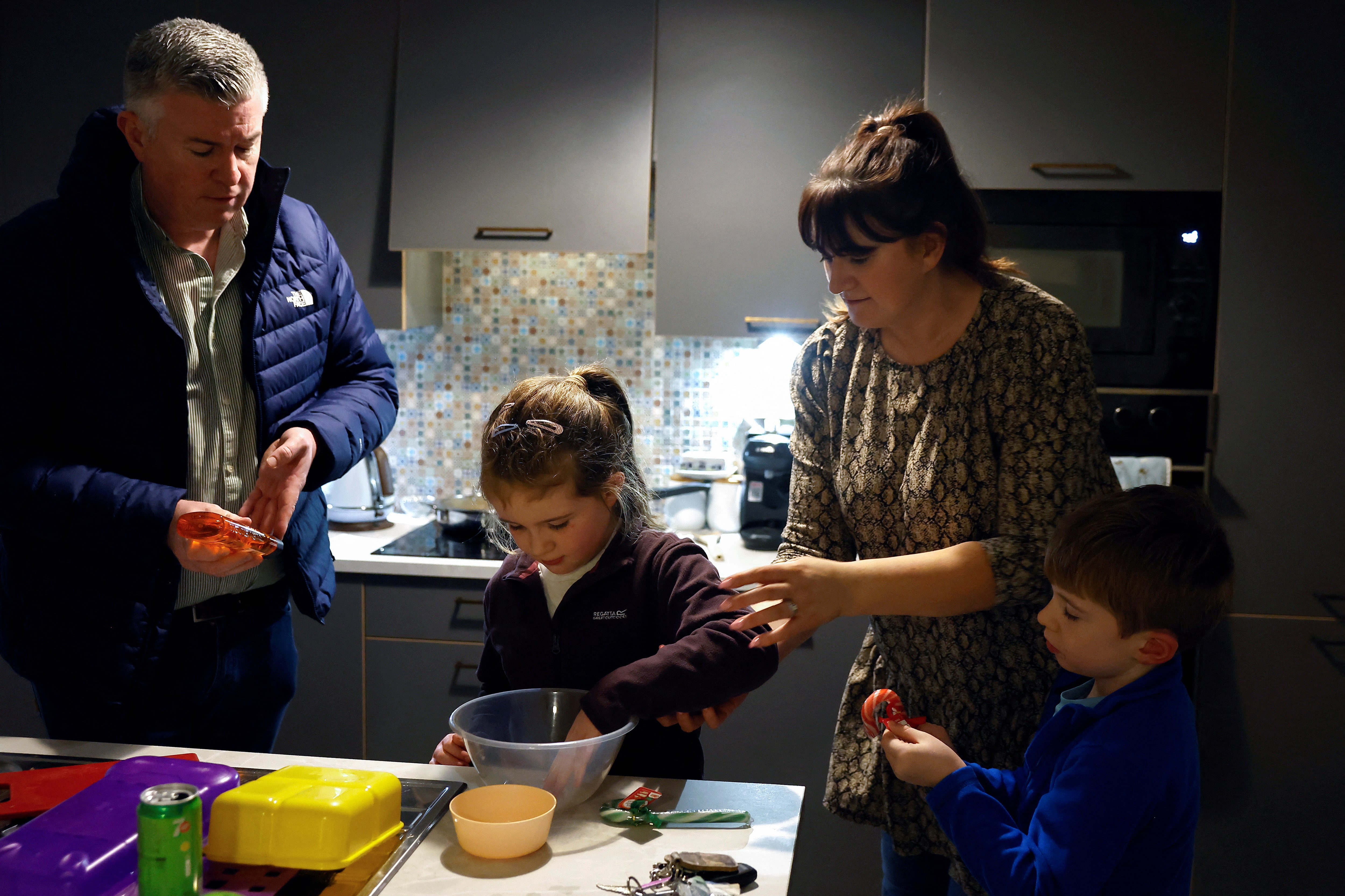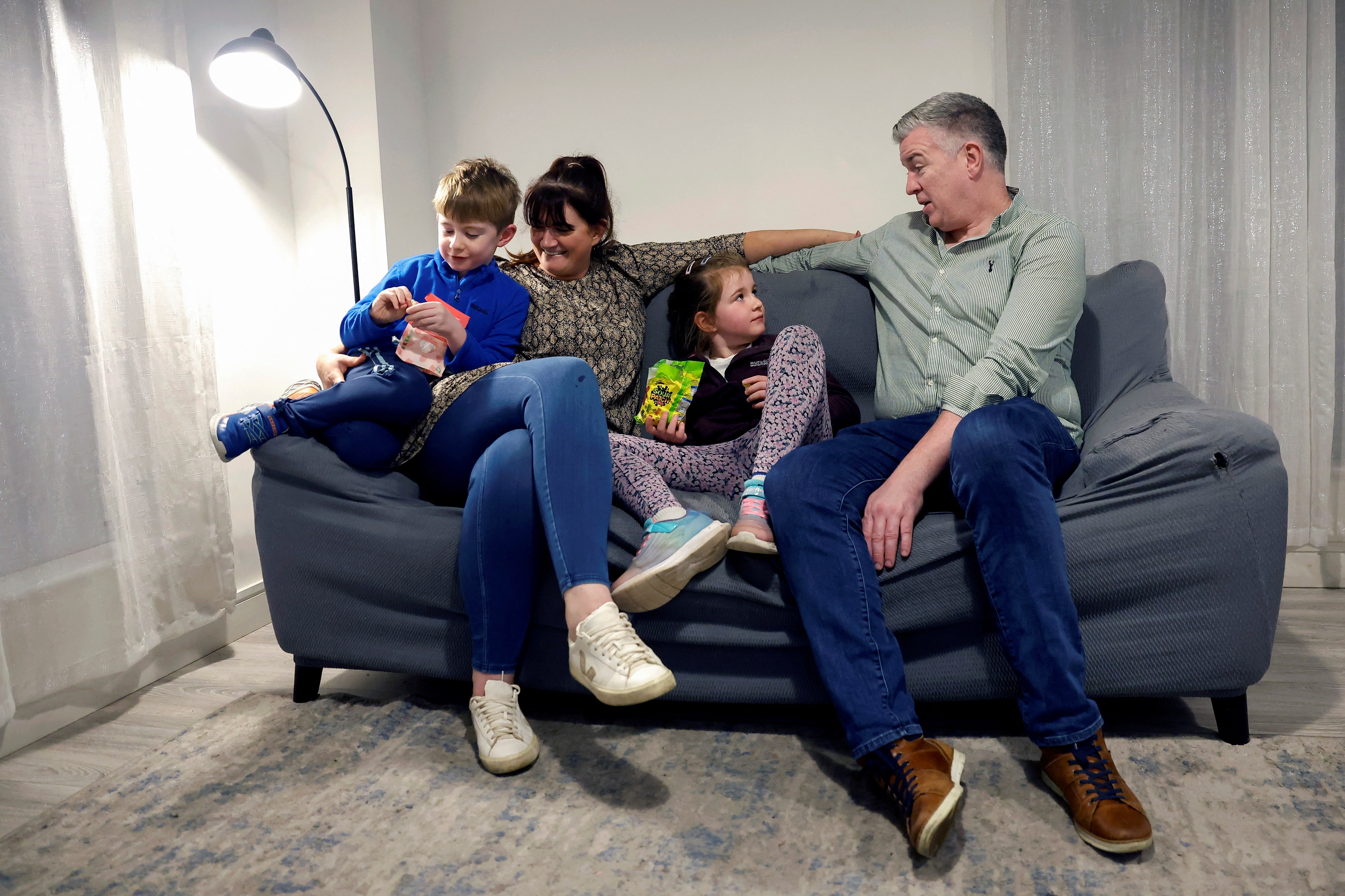第1项,共5项 Sharon和John Fogarty在爱尔兰都柏林纽卡斯尔郊区的厨房沙发上与他们的双胞胎Grace和Oliver(6岁)放松,2024年11月20日。路透社/Clodagh Kilcoyne/档案照片