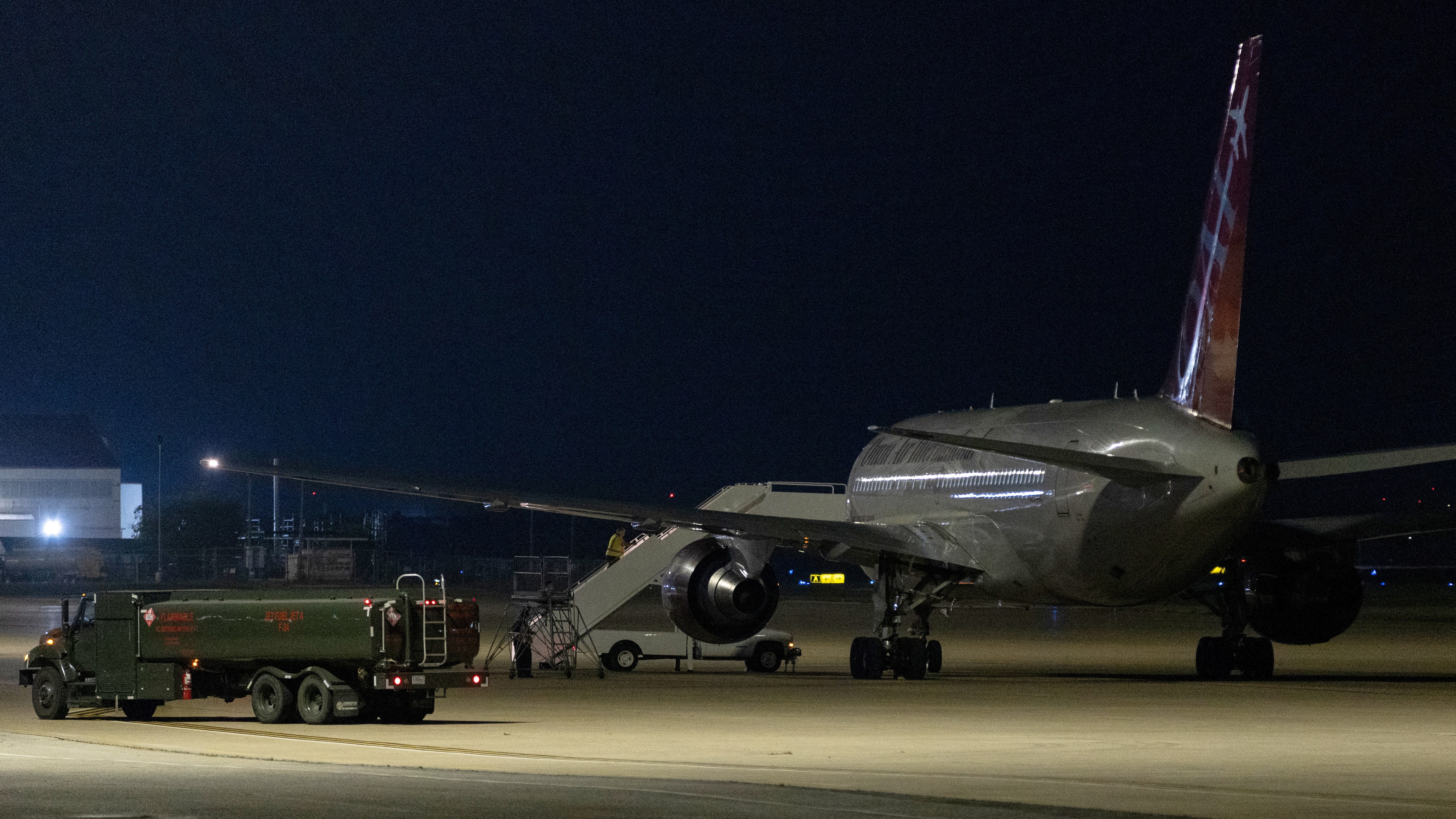 项目 1 共 2 一架包机 Omni Air International 飞机在德克萨斯州圣安东尼奥等待加油,此次飞行载着三名美国公民马克·斯威丹、凯·李和约翰·梁,他们在中国被释放,日期为 2024 年 11 月 27 日。路透社/斯科特·巴尔