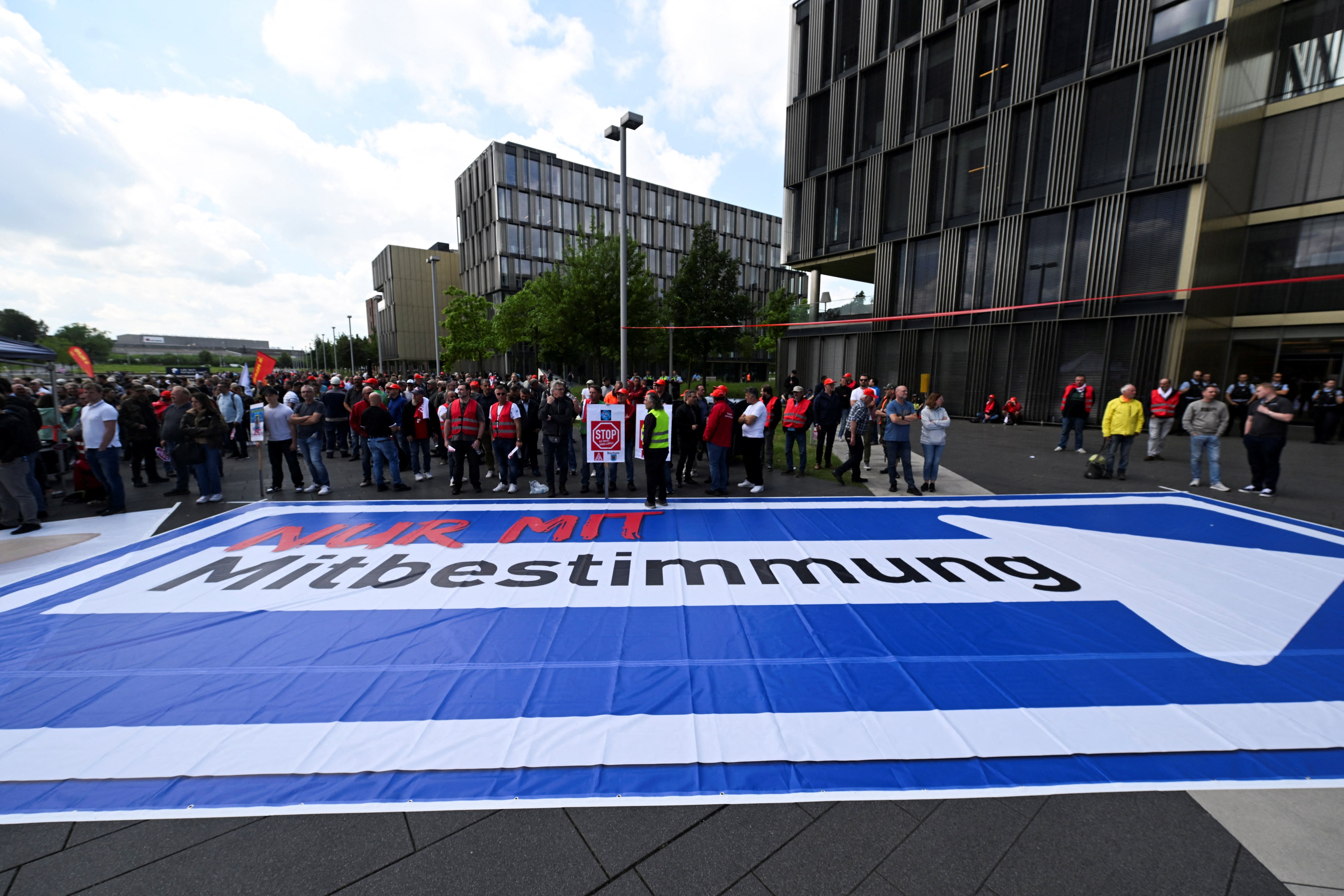 第1项,共2项档案:人们站在一个写着“只有参与”的横幅旁边,在德国埃森举行的IG Metall示威活动中,Thyssenkrupp的钢铁工人举行集会,2024年5月23日。路透社/Jana Rodenbusch