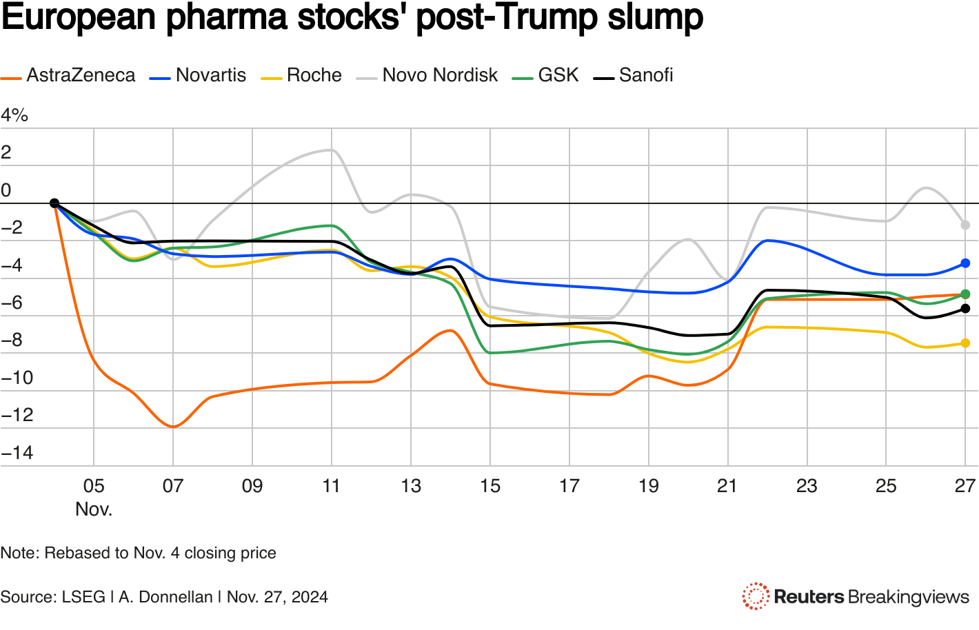 伦敦,11月28日(路透社Breakingviews)- 目前,欧洲制药集团面临的最大威胁来自美国。总统当选人唐纳德·特朗普和他提名的卫生部长罗伯特·F·肯尼迪(Robert F. Kennedy Jr)构成了一种“美国优先”民族主义和反制药商情绪的有毒鸡尾酒,这对价值4800亿美元的诺和诺德(Novo Nordisk)(NOVOb.CO)、价值2300亿美元的罗氏(Roche)(ROG.S)及其他公司来说都是双重打击。具有讽刺意味的是,减轻这些风险的最佳方法是更接近问题的源头。更多的美国制造投资,甚至并购,可能会有所帮助。特朗普的胜利对制药商造成了影响。六家主要的欧洲公司——诺和诺德、罗氏、诺华(Novartis)(NOVN.S)、阿斯利康(AstraZeneca)(AZN.L)、葛兰素史克(GSK)(GSK.L)和赛诺菲(Sanofi)(SASY.PA)——自选举前一天以来,集体损失了860亿美元,或6%的股权价值,而主要美国集团的总跌幅仅为2%。行业普遍担心的是肯尼迪,他被称为RFK,对制药行业普遍不信任,尤其是对疫苗。欧洲制药商的消息人士告诉Breakingviews,他们担心他缺乏公共卫生背景和普遍的反科学立场。美国制药商也应该有同样的感觉。然而,困扰圣诺菲、罗氏及其地区同行投资者的是,RFK和特朗普的议程可能带有反欧洲倾向。在九月,这位内阁提名人表示,立法者应该限制药品价格,以便制药集团不能向美国患者收取远高于大西洋另一侧患者的费用。他在《华尔街日报》的一篇评论中写道,这种差异与欧洲国家卫生当局倾向于代表整个国家与制造商谈判有关,从而使他们能够保持低价。在美国则没有这种情况。RFK提到诺和诺德的糖尿病和减肥药物Ozempic作为例子,指出在德国其价格仅为美国价格的十分之一。这对欧洲人来说是一个敏感领域,因为大西洋另一侧的高价格往往为药物研究和全球其他地区的低价销售提供补贴。