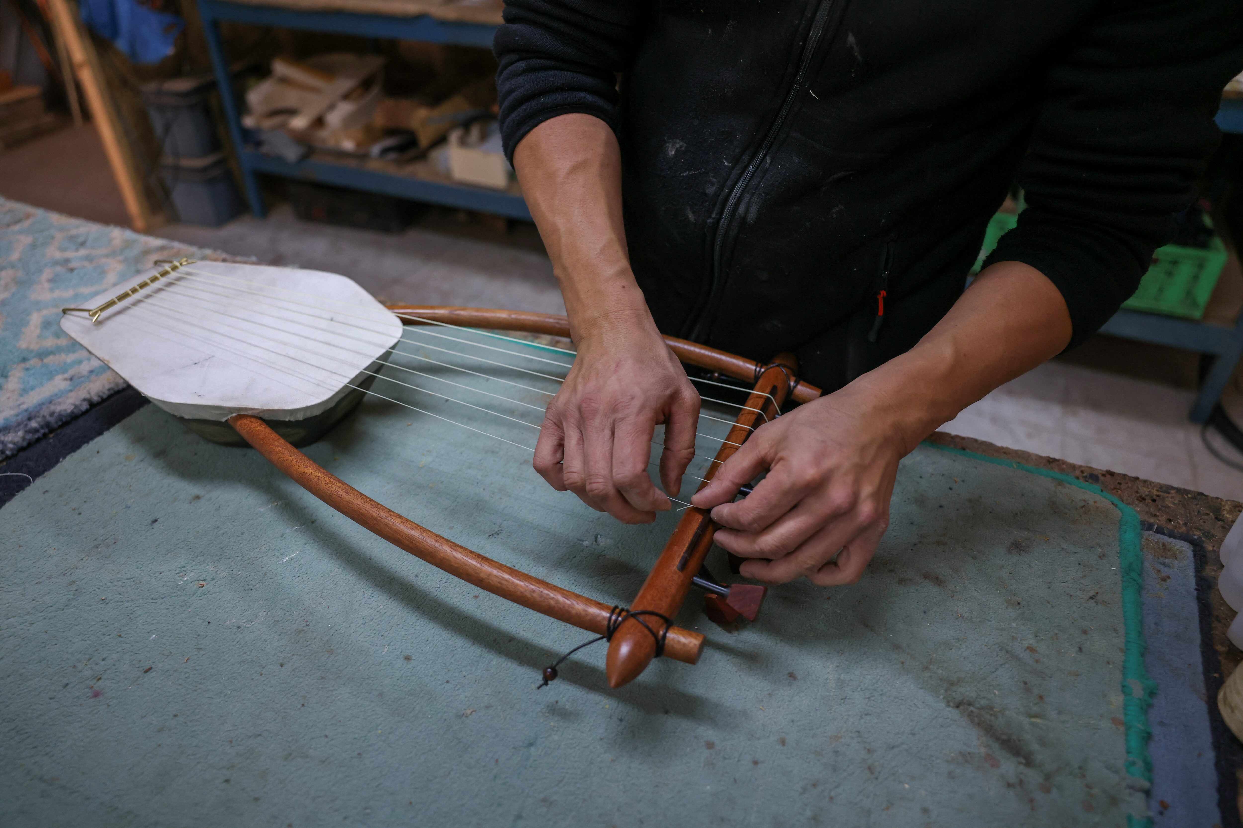 第1项,共8项 丹尼斯·库马尔齐斯,41岁,在希腊北部埃夫罗波斯的工作室中制作古希腊里拉的复制品,2024年11月18日。路透社/亚历山德罗斯·阿夫拉米迪斯