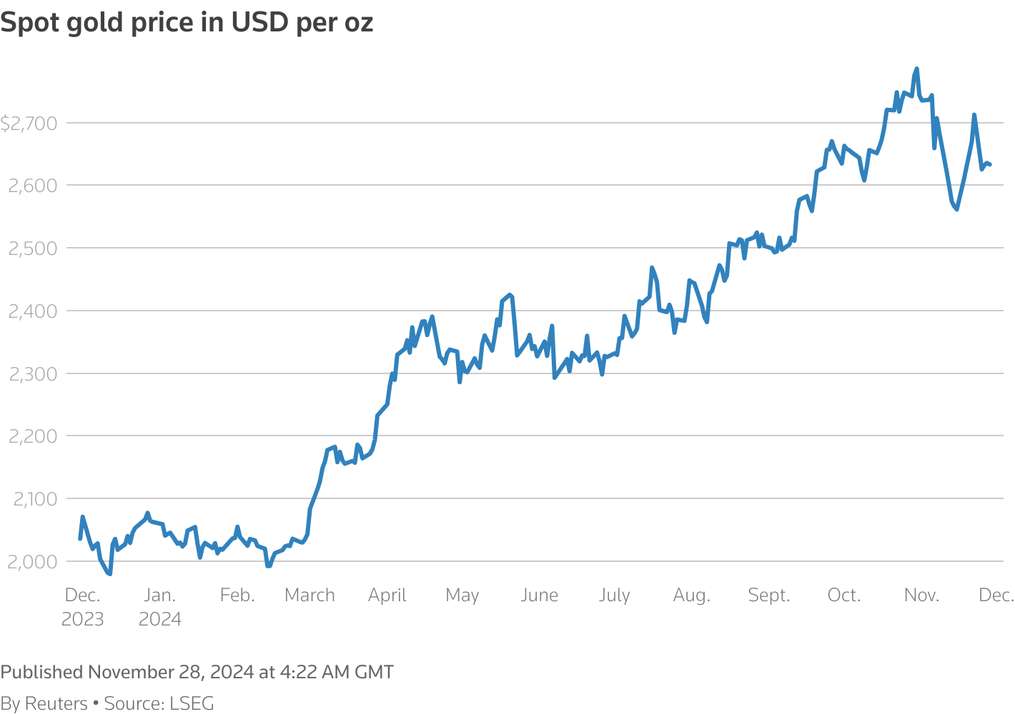 11月28日(路透社) - 周四,黄金价格上涨,此前美国通胀放缓的数据增强了市场对下个月美联储降息的预期。