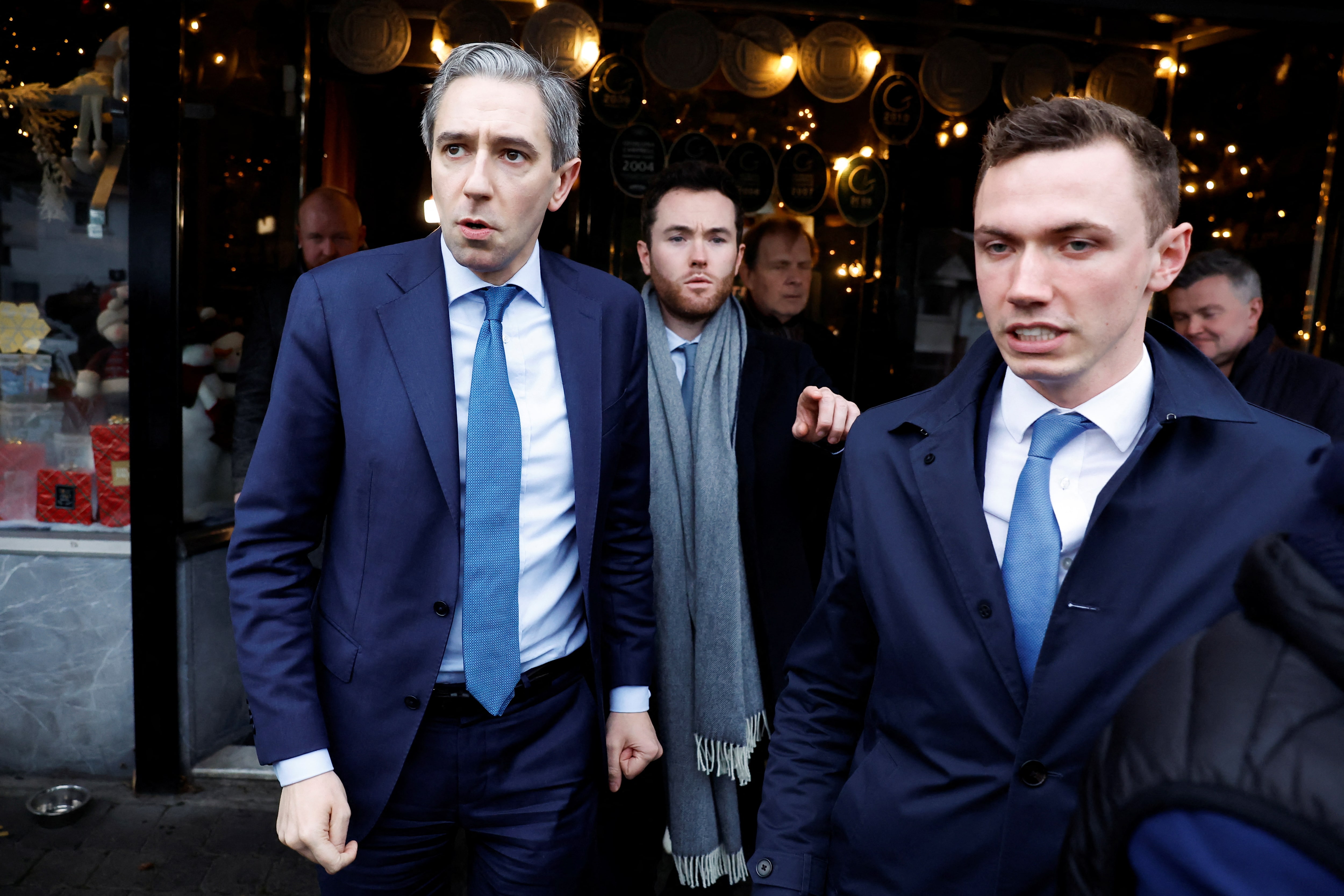 项目 1 共 3 爱尔兰总理(首相)和芬盖尔党领导人西蒙·哈里斯在爱尔兰都柏林进行拉票,时间为2024年11月28日。路透社/克洛达·基尔科因