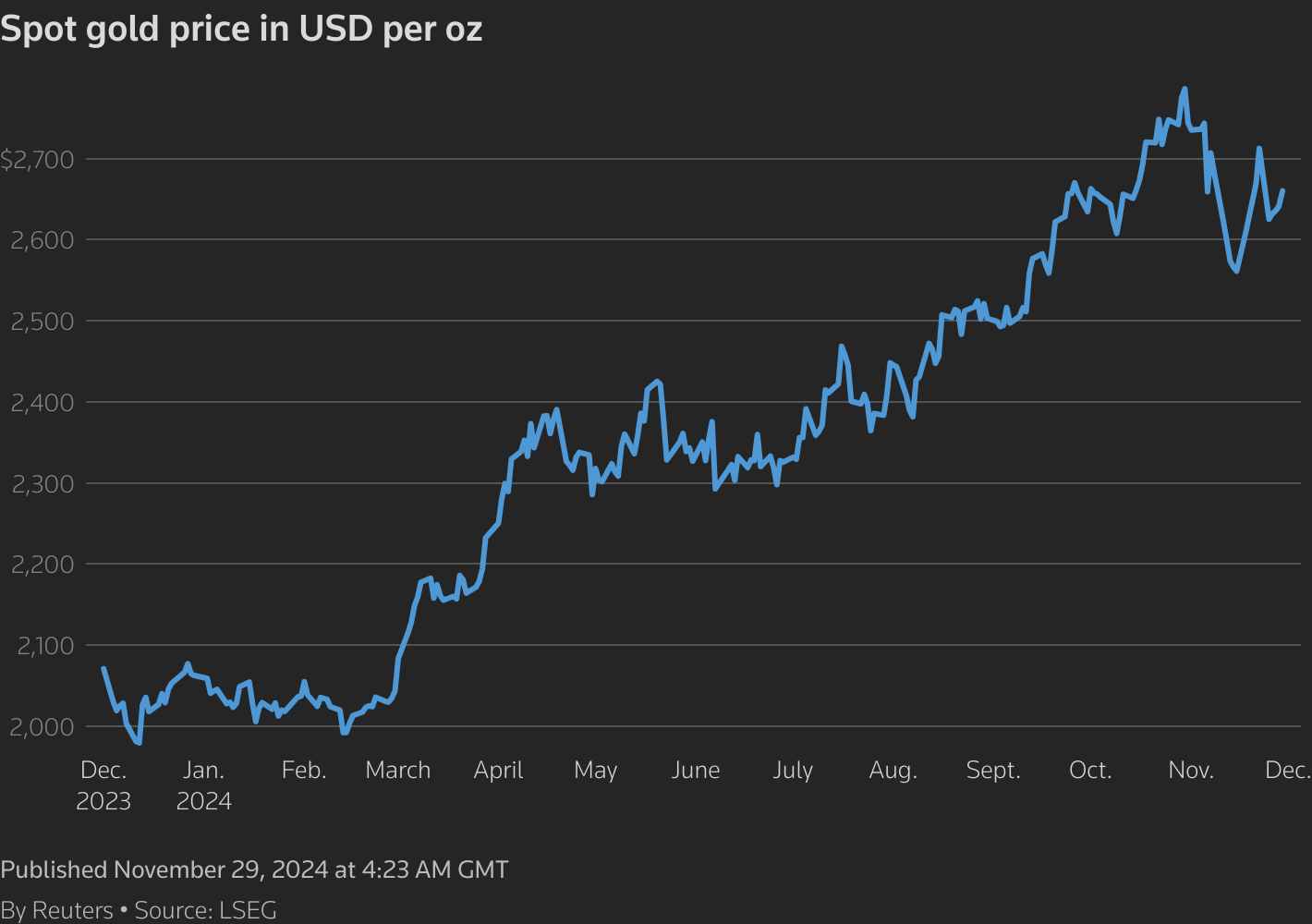 11月29日(路透社)- 黄金价格周五上涨约1%,受到美元走弱和地缘政治问题的支持,但由于本月在唐纳德·特朗普在美国的选举胜利后美元反弹,黄金正朝着自2023年9月以来最差的月度表现迈进。