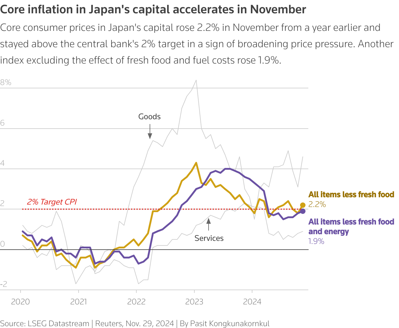 东京/伦敦,11月29日(路透社)- 日元兑美元上涨超过1%,触及六周来的最高点,此前通胀数据强于预期,推动市场对日本银行下个月加息的预期。