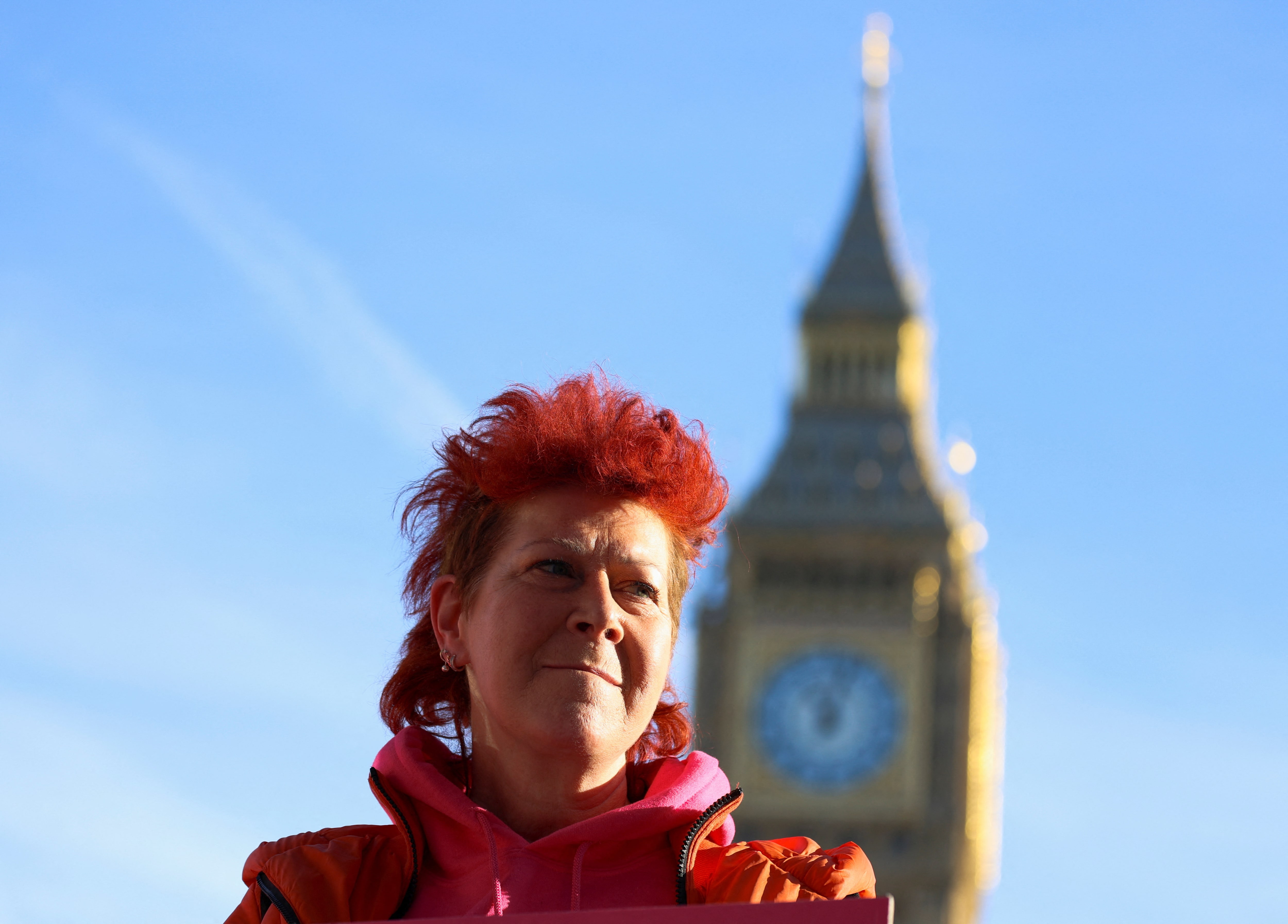 项目 1 共 3 杰妮·卡鲁瑟斯(Jenny Carruthers),一位身患绝症并支持《绝症成年人(生命终结)》法案的人,等待在国会广场,英国立法者正在辩论是否允许对绝症成年人进行协助死亡,地点:英国伦敦,日期:2024年11月29日。路透社/米娜·金(REUTERS/Mina Kim)