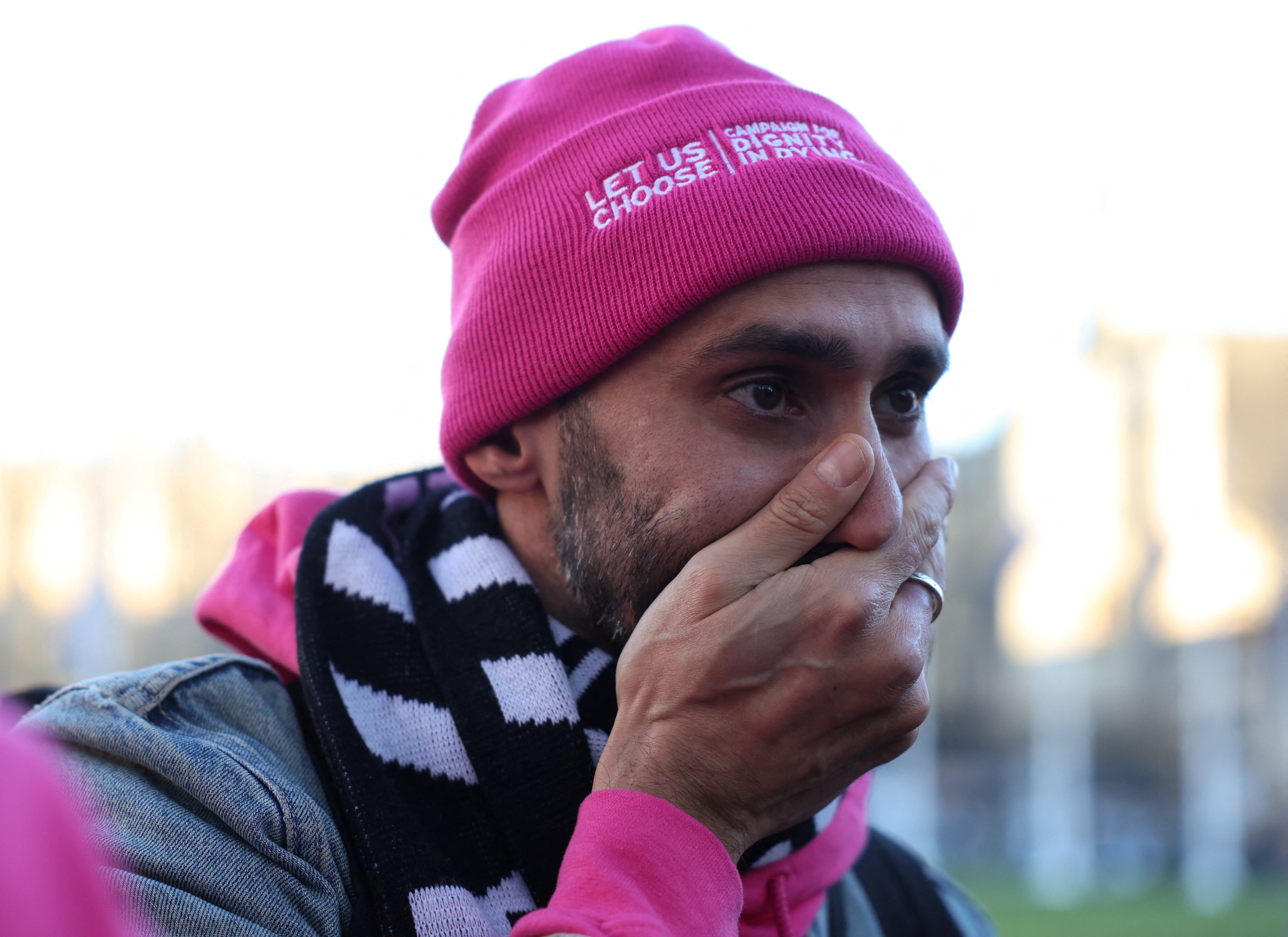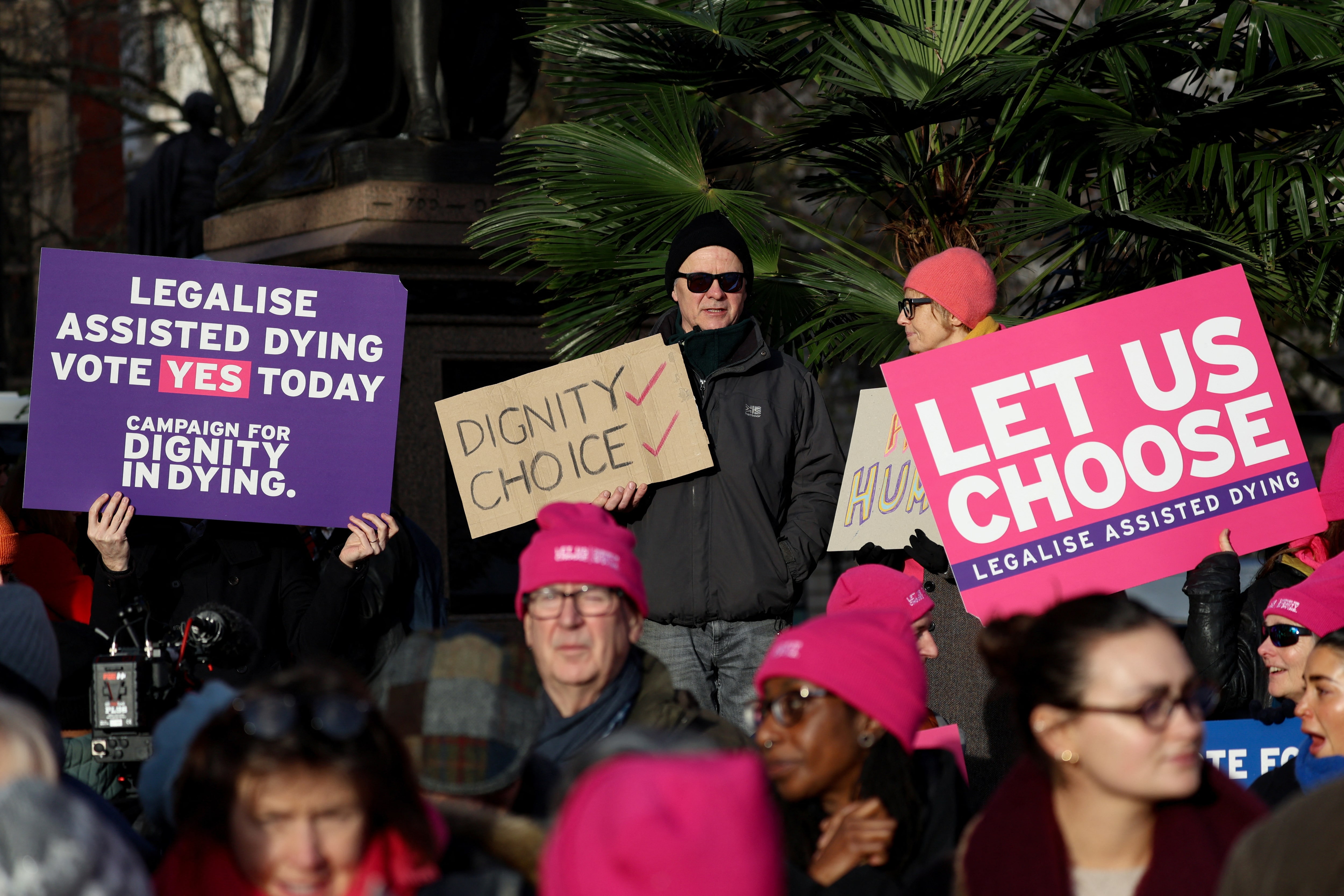 支持协助死亡的人们在周五聚集在议会外,观看他们手机上的投票情况。有些人双手合十,仿佛在祈祷。