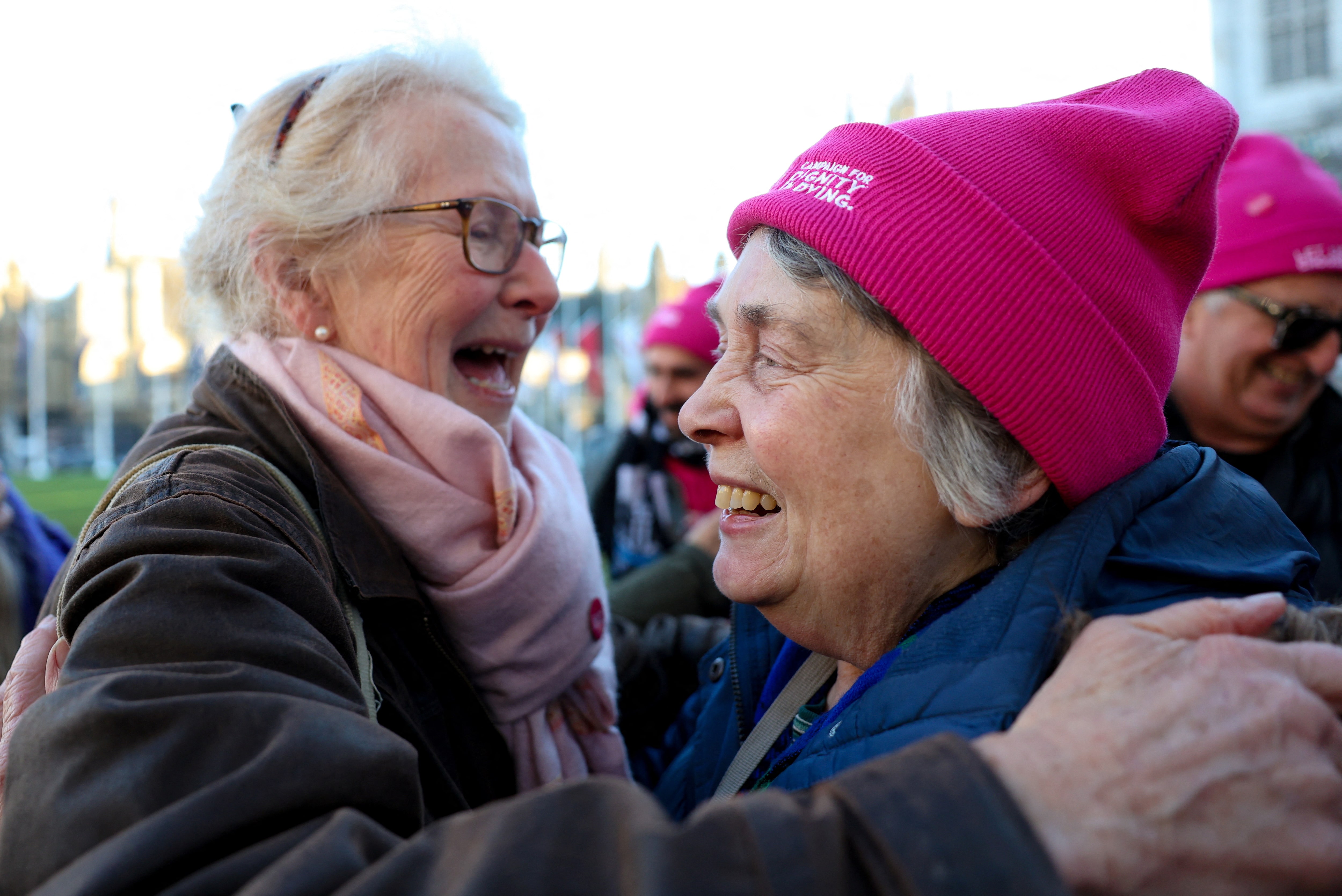 第1项,共10项 女性在英国议会外支持协助死亡的示威中互相拥抱,此前立法者投票支持协助死亡法案,地点:英国伦敦,日期:2024年11月29日。路透社/米娜·金