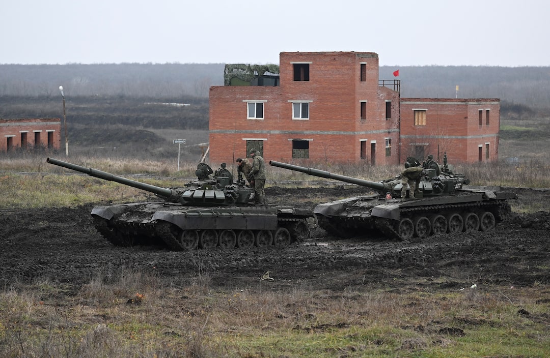 两名俄罗斯军人站在T-72坦克上,参加在俄罗斯南部克拉斯诺达尔地区举行的军事演习,地点为射击场,时间为2024年12月2日,正值俄乌冲突期间。路透社/谢尔盖·皮沃瓦罗夫/档案照片
