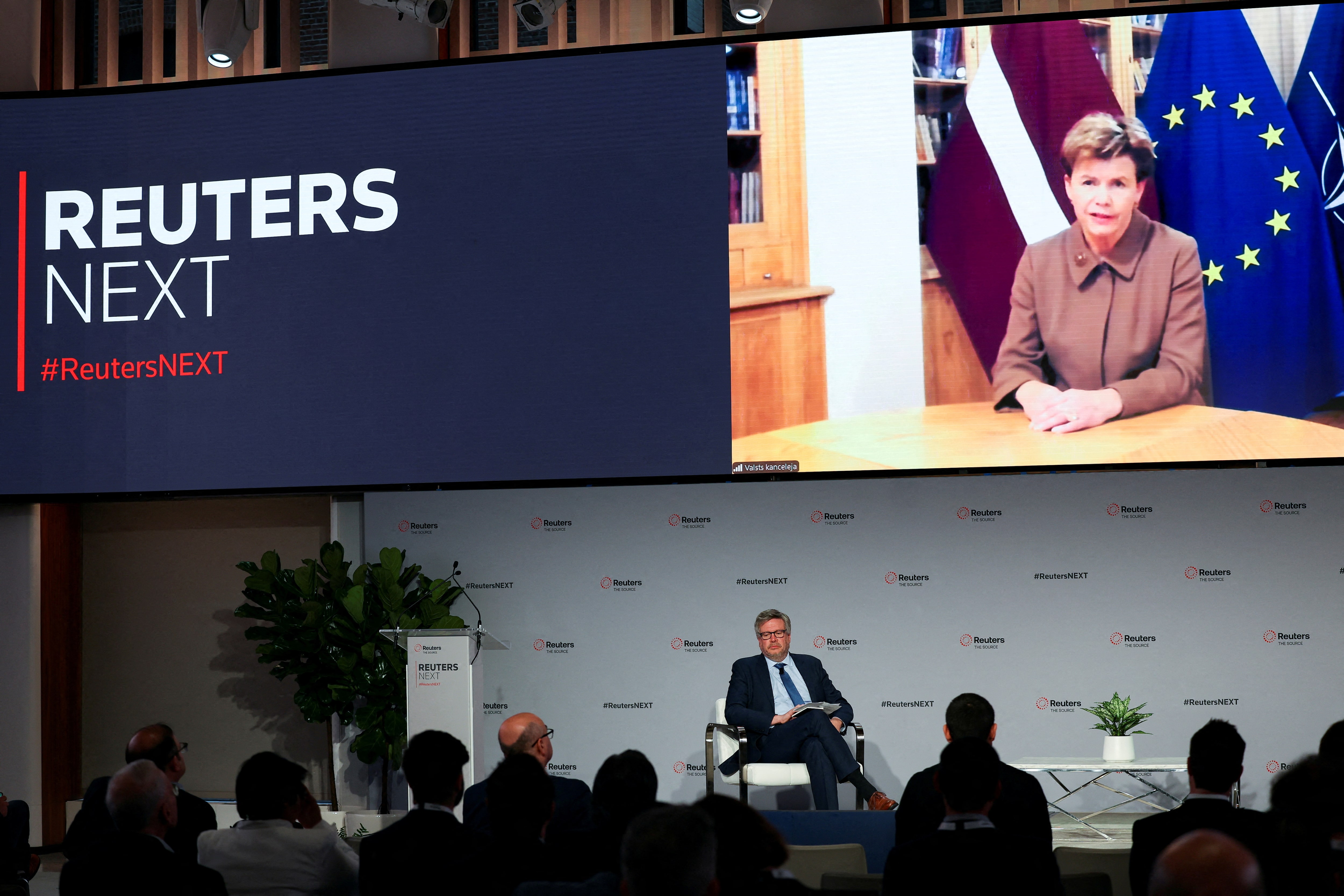拉脱维亚外交部长拜巴·布拉泽在纽约市路透社NEXT会议上出现在屏幕上,西蒙·罗宾逊在旁观看,2024年12月10日。路透社/迈克·塞加路透社上个月报道普京愿意与特朗普讨论乌克兰停火协议,但排除了做出任何重大领土让步,并表示基辅必须放弃加入北约的雄心。布拉泽承诺拉脱维亚将在当选总统唐纳德·特朗普的任期开始时与他的所有成员合作,例如提名的国务卿马尔科·鲁比奥,他将成为她的对口。