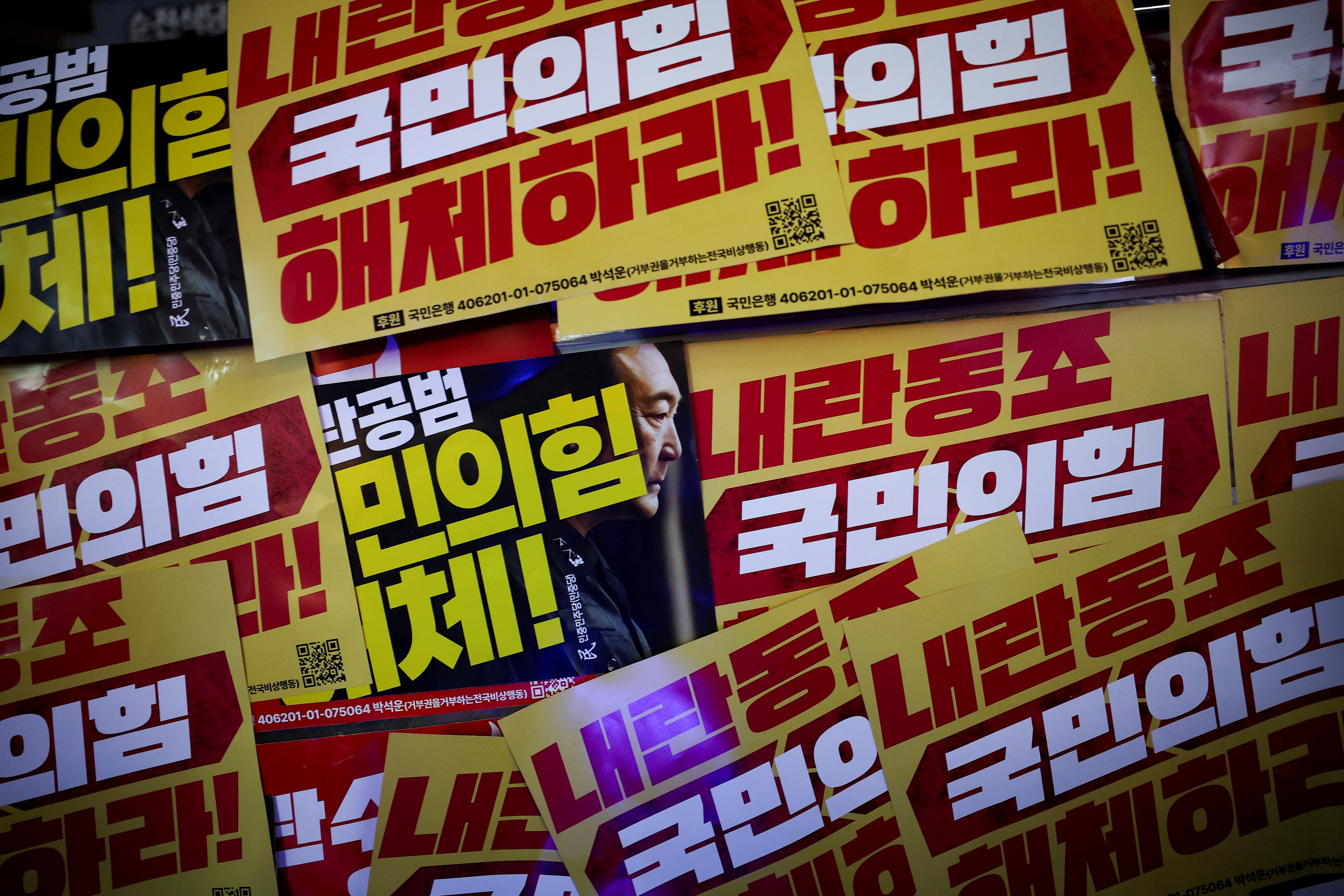 一张印有韩国总统尹锡悦的标语牌被放置在其他标语牌中,呼吁弹劾宣布戒严的韩国总统尹锡悦,戒严在几个小时后被撤销,地点位于韩国首尔执政的人民力量党总部前,时间为12月10日,…阅读更多首尔,12月11日(路透社) - 北韩国家媒体KCNA周三首次报道了自尹锡悦总统尝试实施戒严以来,韩国持续的政治动荡。