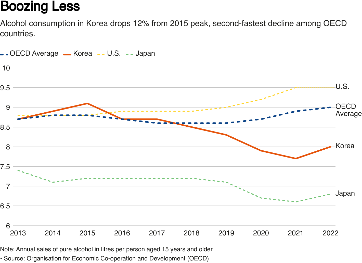 韩国的酒精消费从2015年的高峰下降了12%,是经济合作与发展组织国家中下降速度第二快的。