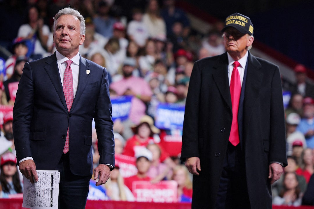 第1项,共2项 商人史蒂夫·维特科夫在乔治亚州梅肯的Atrium Health Amphitheater举行的竞选集会上与共和党总统候选人、前美国总统唐纳德·特朗普同台站立,时间为2024年11月3日。路透社/布赖恩·斯奈德/档案照片