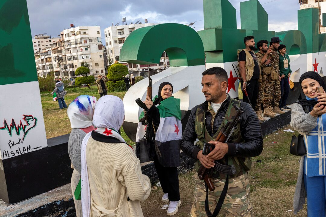 第1项,共6项 多人正在与叙利亚执政团体的战斗人员借来的旗帜和步枪自拍,在叙利亚拉塔基亚市中心的广场上。2024年12月12日。路透社/Umit Bektas