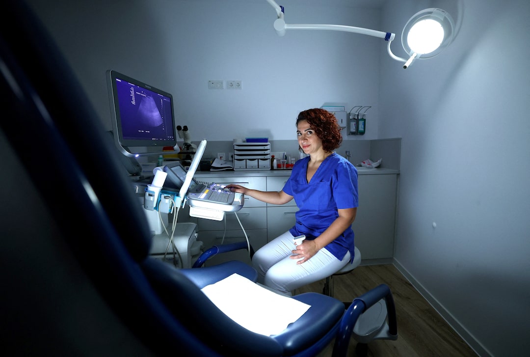 叙利亚妇科医生桑迪·伊萨,36岁,在德国柏林的一家诊所与超声波设备合影,2024年12月12日。路透社/莉西·尼斯纳