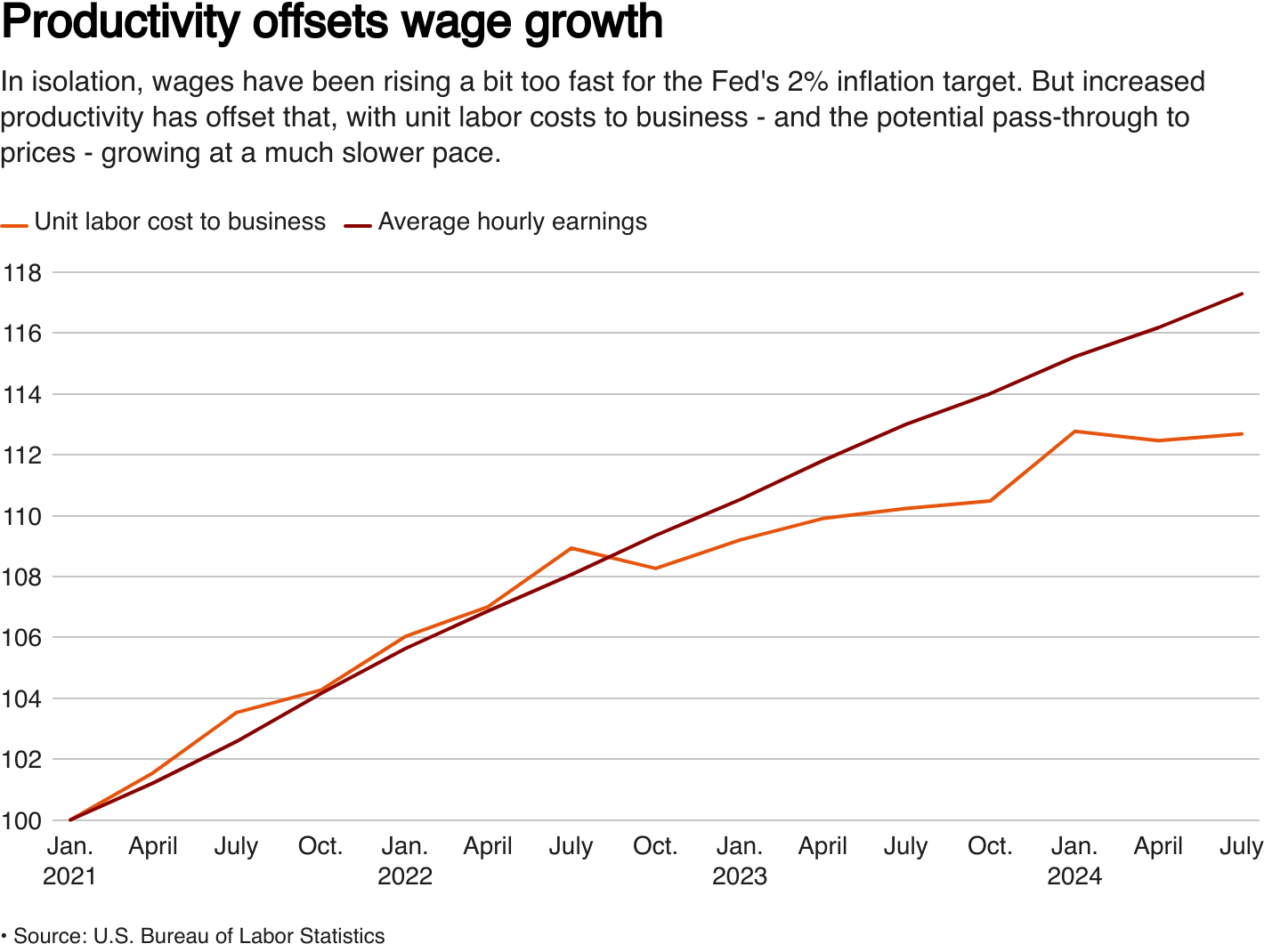 最近数据中的另一个令人愉快的惊喜:随着时间的推移,工人的生产力持续提高,这些改善足以缓解本来会过高的工资增长,以至于超出美联储的通货膨胀舒适区。