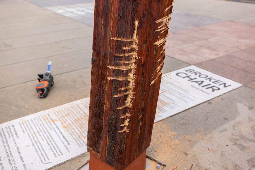 两名女性将乌克兰国旗作为吊袜带,边锯边喊“让俄罗斯远离联合国”和“去你妈的俄罗斯”,在被称为破椅子的纪念碑上留下了十多个伤痕。这座三腿结构是瑞士艺术家丹尼尔·贝尔塞特于1997年在国家广场上竖立的作品,已成为日内瓦市的地标。它旨在提高人们对冲突地区地雷对平民影响的认识。