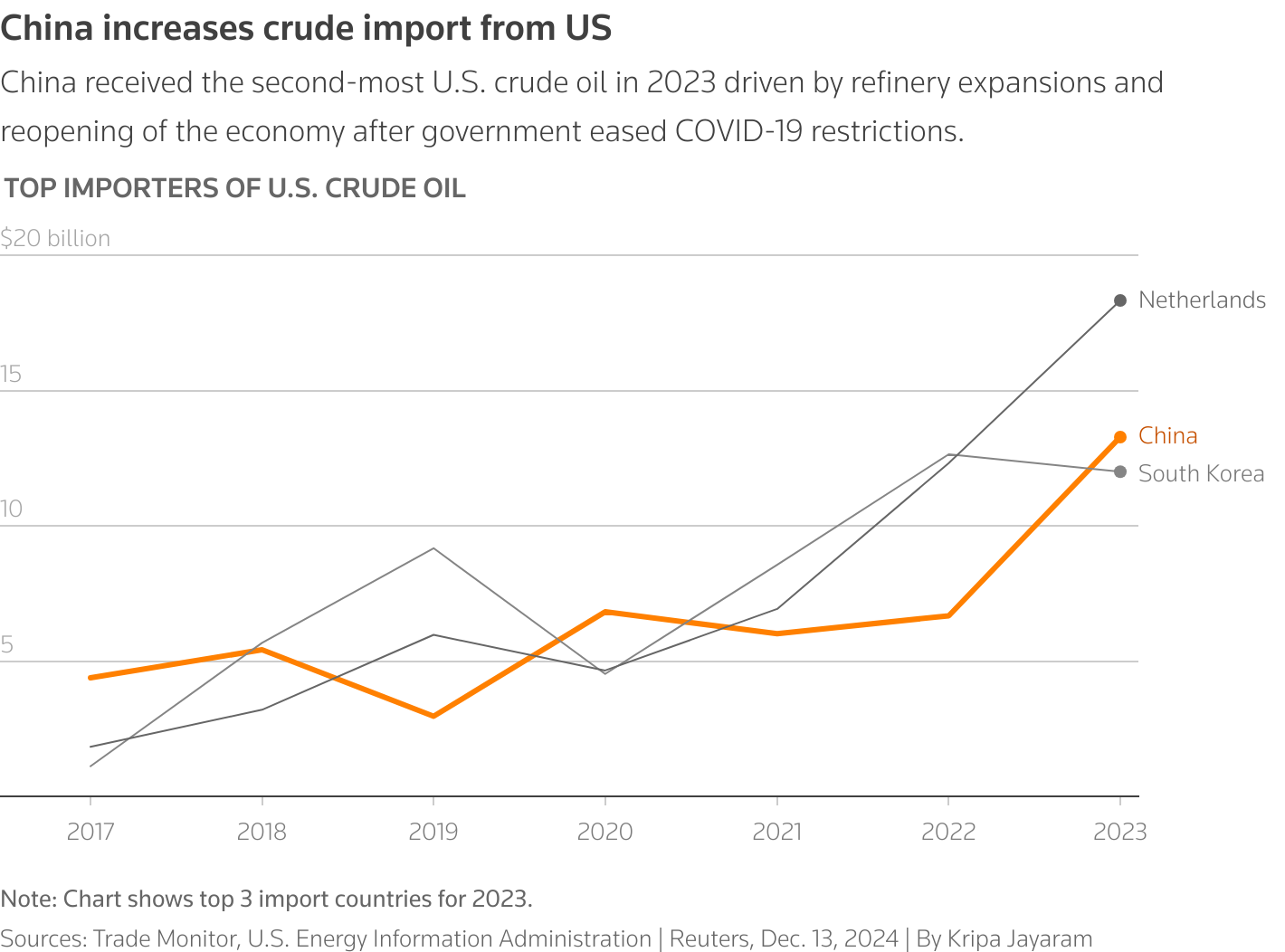 该折线图显示了荷兰、中国和韩国从美国进口的原油量。