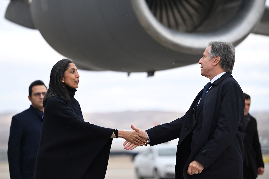 第1项,共2项 美国国务卿安东尼·布林肯在2024年12月13日于土耳其首都安卡拉会晤后,与美国驻土耳其外交使团代理首席代表维拉吉·勒巴伊利握手,然后登上飞机。 安德鲁·卡巴列罗-雷诺兹/路透社