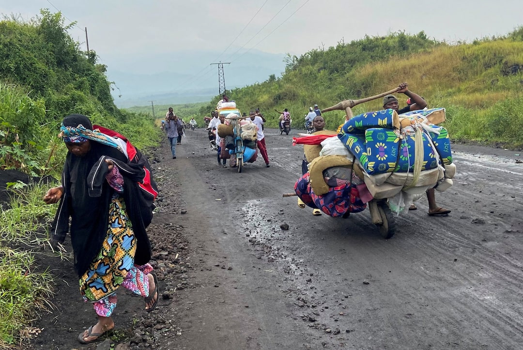第1项,共2项 平民在逃离后推着一种称为Tshikudu的木制手推车,因重枪声引发了对M23叛军沿着从萨克到戈马的道路推进的担忧,地点位于刚果民主共和国北基伍省,时间为2023年2月9日。路透社/Djaffar Sabiti/档案照片