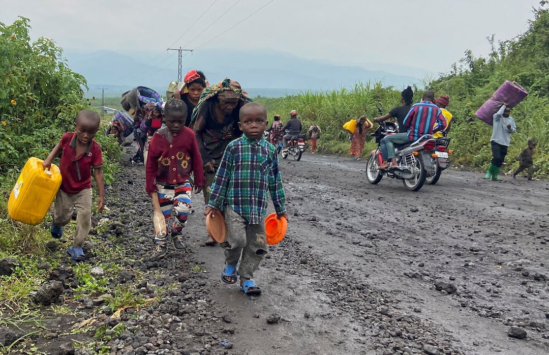 第1项,共2项 平民在逃离后推着一种称为Tshikudu的木制手推车,因重枪声引发了对M23叛军沿着从萨克到戈马的道路推进的担忧,地点位于刚果民主共和国北基伍省,时间为2023年2月9日。路透社/Djaffar Sabiti/档案照片