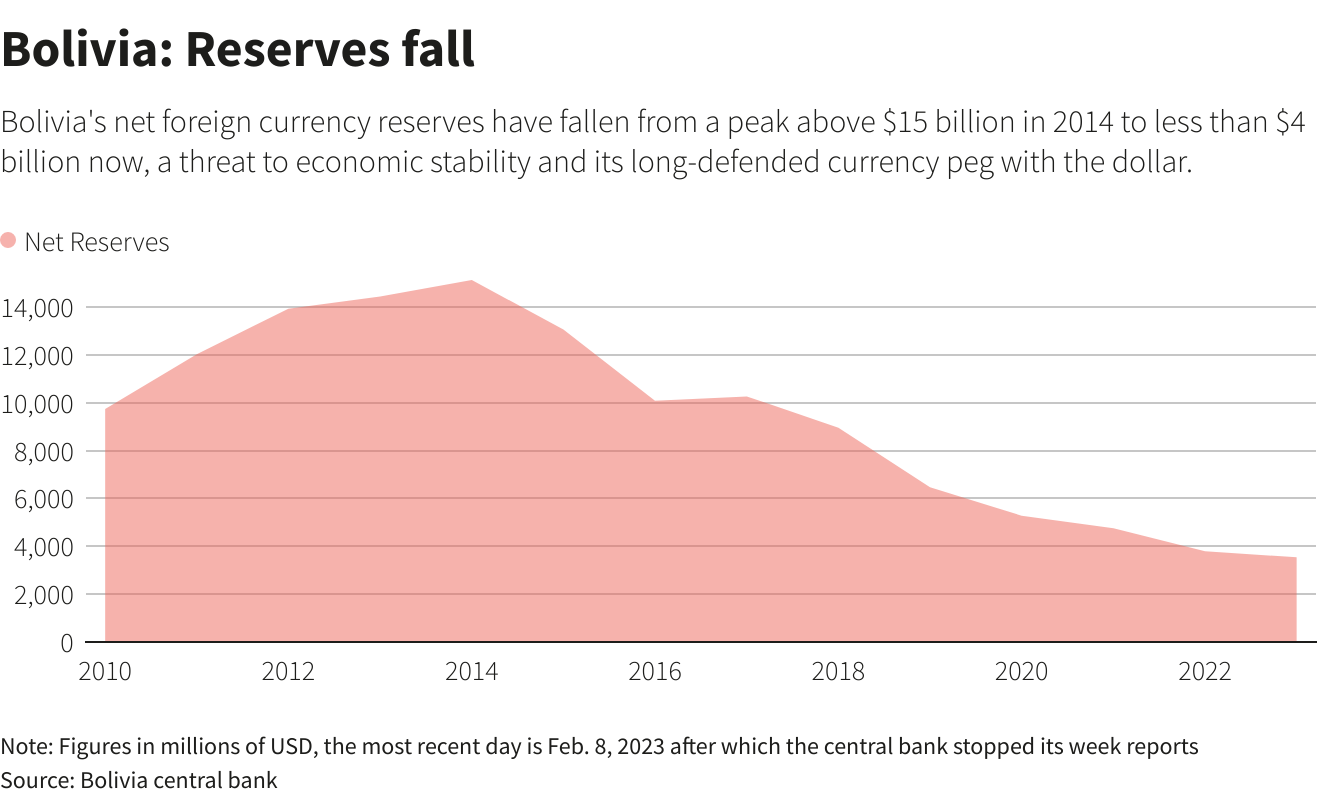 玻利维亚中央银行的外汇储备在过去十年中崩溃。