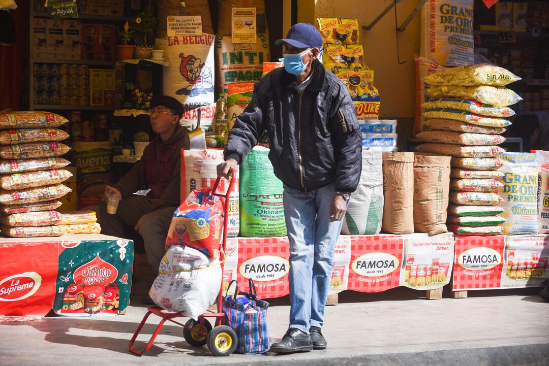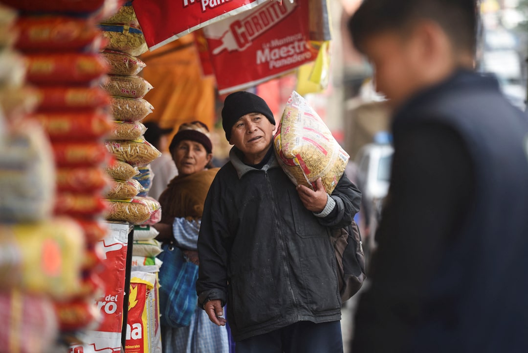 第1项,共5项 一名男子在玻利维亚拉巴斯的市场上提着一袋面条,2024年12月13日。路透社/克劳迪娅·莫拉莱斯