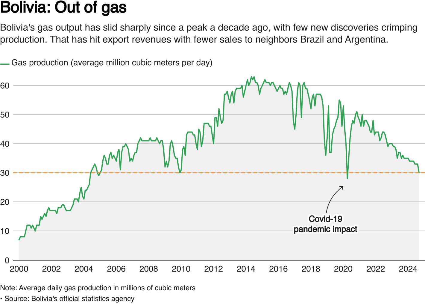 玻利维亚的天然气出口,外汇收入的关键来源,在过去十年中减半,因为生产商没有找到新的气田来替代那些已经开采完的气田。中央银行的外汇储备几乎耗尽,这影响了燃料进口,推高了价格,并加剧了玻利维亚诺货币的压力。