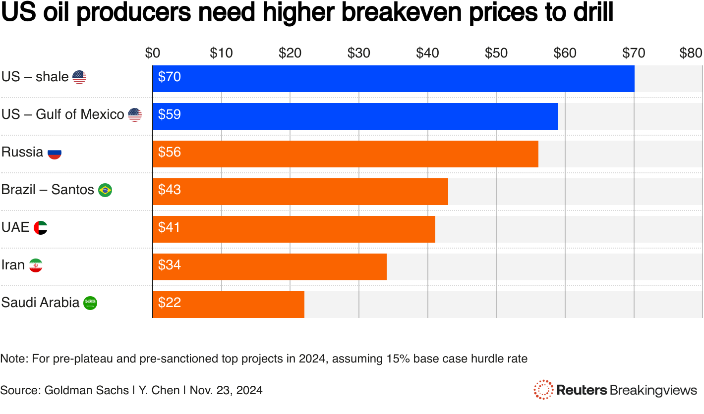 在1300万桶的日生产量下,美国的石油日产量是世界最高的。但根据高盛的说法,在关键的二叠纪地区,钻探新井和管理15%回报所需的原油价格是11月下旬交易的每桶70美元。美国大部分石油生产是在私人土地上,而不是特朗普控制的公共区域。随着国际能源署等预测者预计到2025年将出现每日100万桶的价格压制供应过剩,以及石油输出国组织和俄罗斯等附属国希望解除减产,可能美国的石油洪流更像是一个涓涓细流。.
