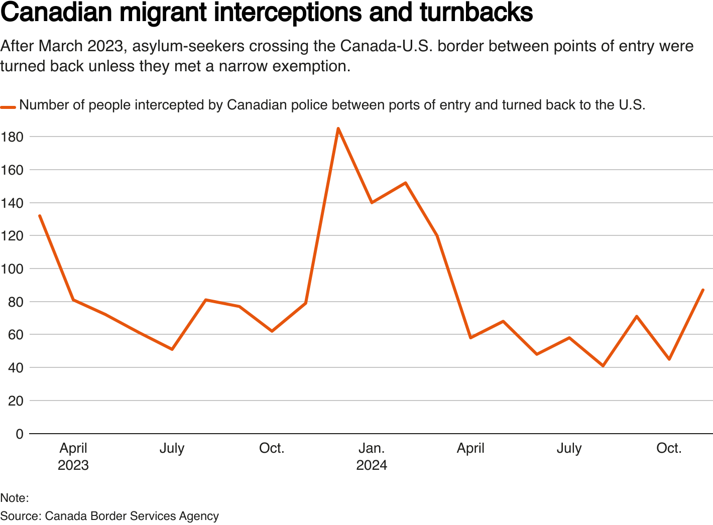 一条折线图显示了2023年3月至2024年11月之间,加拿大警方在入境口岸之间拦截并遣返回美国的人数。