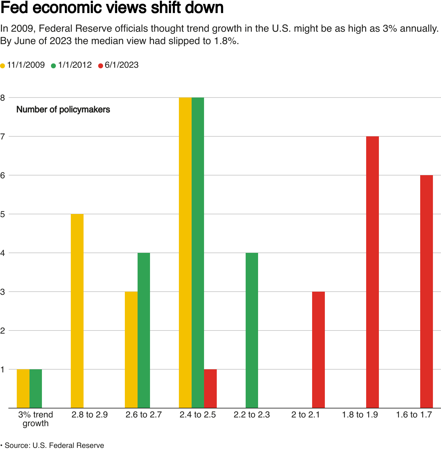 然而,这种可能性在美联储领导人中被更加认真地对待,并可能影响货币政策制定者对经济潜力的看法。在COVID-19大流行之前的几年里,美联储对美国长期可持续增长率的估计不断下调,部分原因是生产力的滞后。