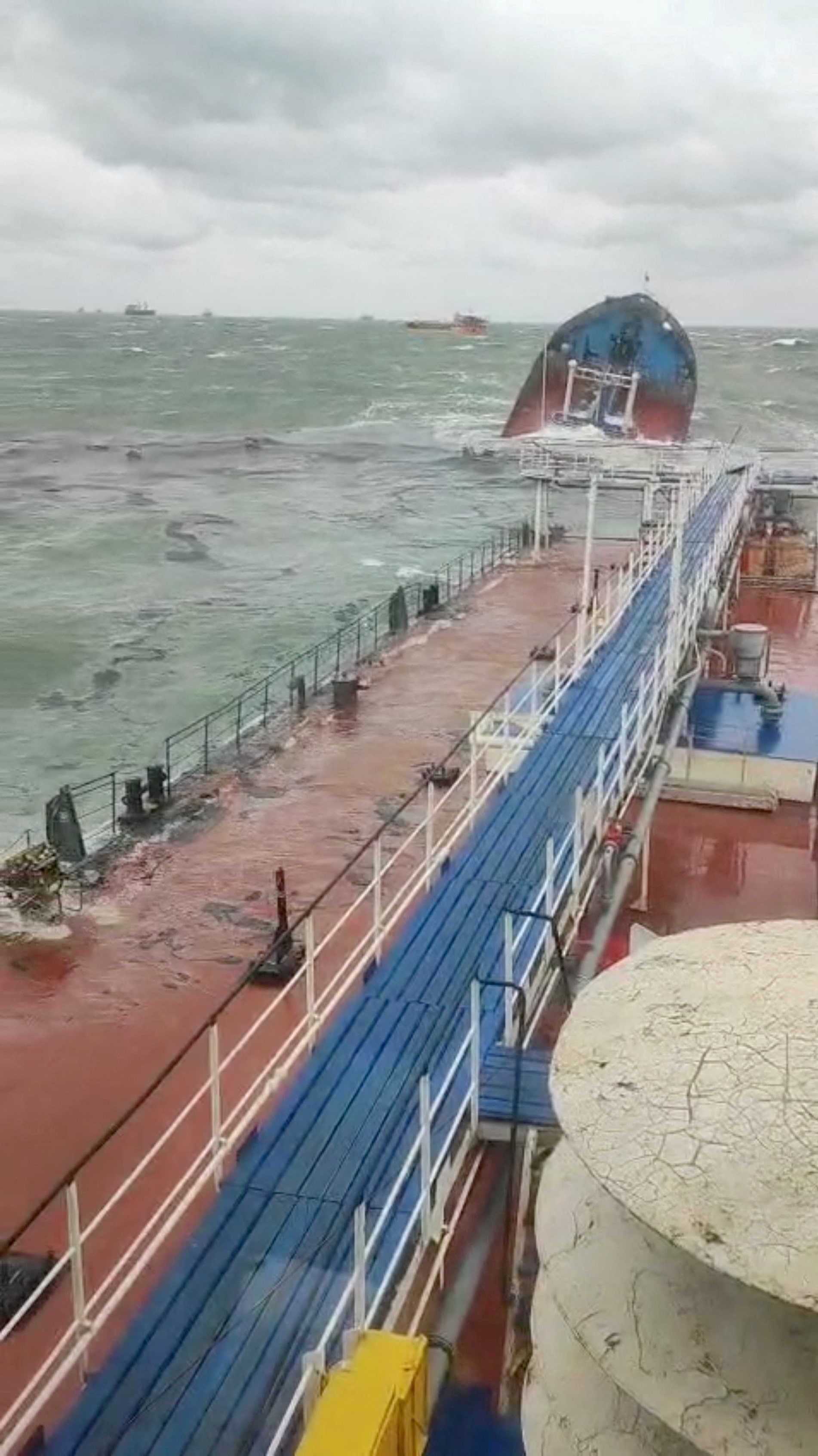 从油轮Volgoneft 239的视角显示出沉没部分的船只,其损坏导致了石油泄漏,发生在2024年12月15日的克里米亚刻赤海峡,这是一段从社交媒体视频中截取的画面。社交媒体/通过路透社塔林,12月16日(路透社) - 十二个西方国家达成协议,采取措施“中断和威慑”所谓的俄罗斯阴影船队,以避免违反制裁并增加莫斯科在乌克兰战争中的成本,爱沙尼亚政府周一表示。