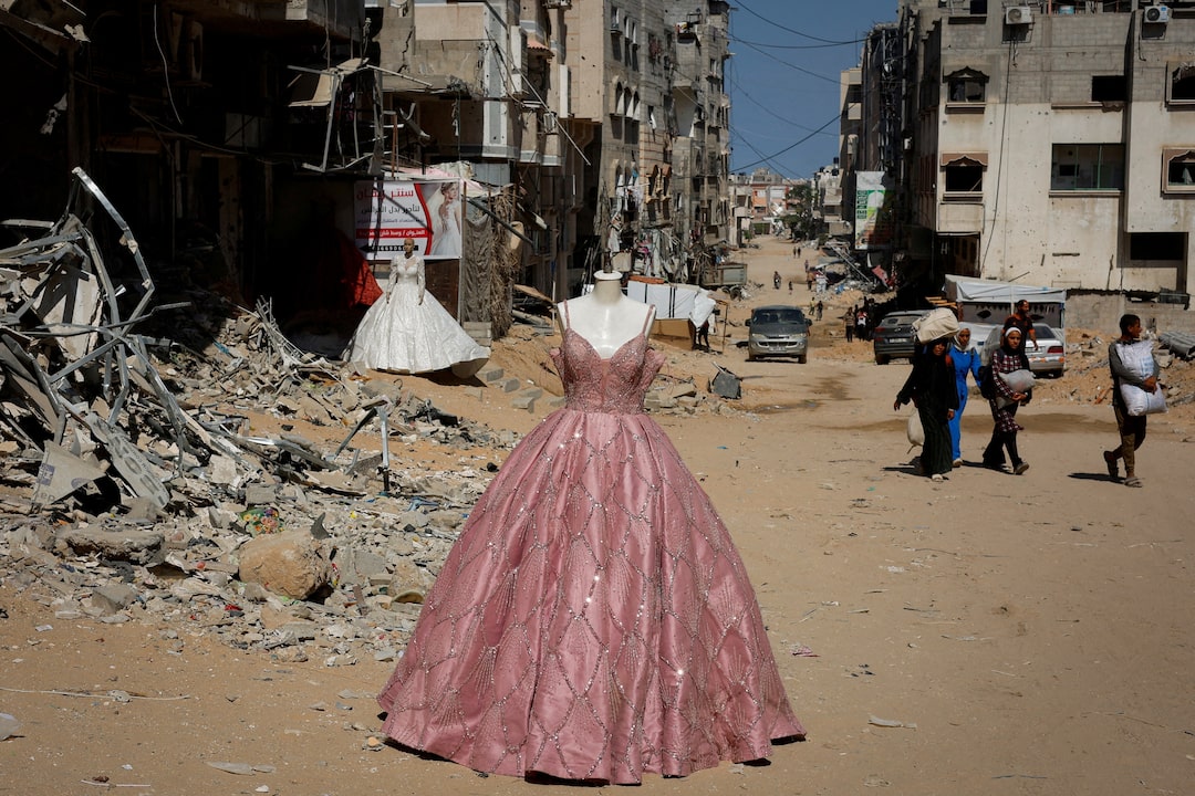 穆罕默德·萨利姆拍摄的粉色婚纱在加沙街头的照片,拍摄于10月7日哈马斯领导的袭击以色列周年纪念日,结合了死亡和生命,他说。在展示婚纱的模特后面,我们看到一栋受损建筑的废墟和人们搬运财物。“尽管生活充满苦涩,尤其是在加沙,那里已经遭受了一年多的痛苦,但仍然有一线希望,生活必须继续,”萨利姆说。