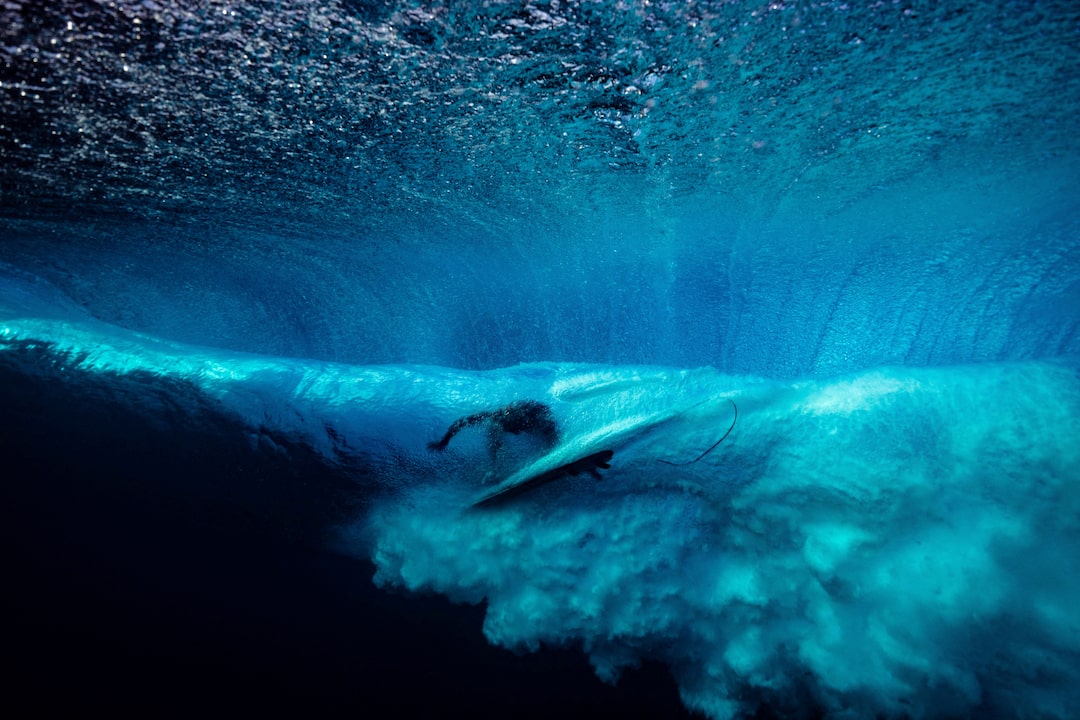 “一名冲浪者抓住了一波浪潮,进入了波桶……我从珊瑚礁底部的宁静中捕捉到了那个确切的瞬间。”