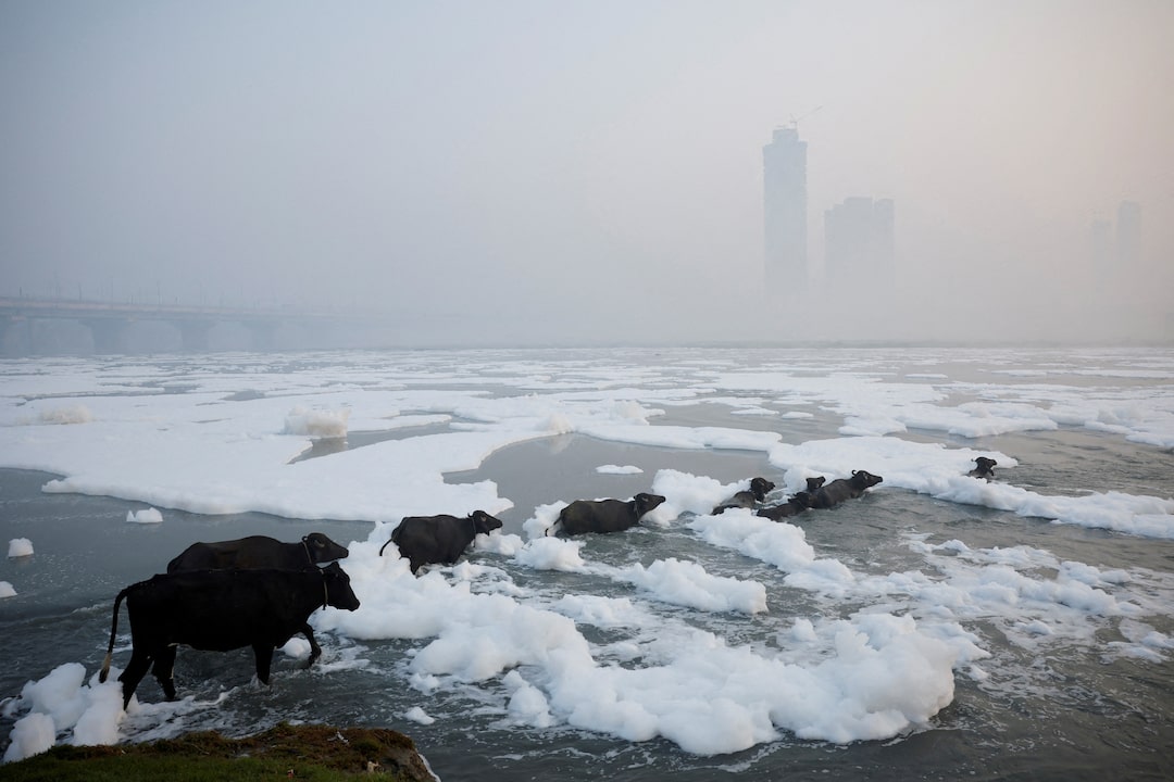 在十一月,阿努什里·法德纳维斯黎明时分出发,旨在展示 德里的污染,每到冬季,随着风速下降和冷空气困住污染物,污染情况愈发严重。由于污泥和未经处理的废物造成的有毒泡沫漂浮在雅穆纳河上。然而,乍一看,法德纳维斯的照片似乎有些超现实——动物在朦胧的梦境中穿行。只有在第二次、更加仔细的观察中,我们才能看到自然与人为污染之间的刺眼对比。背景中的摩天大楼和桥几乎被雾霾遮蔽。