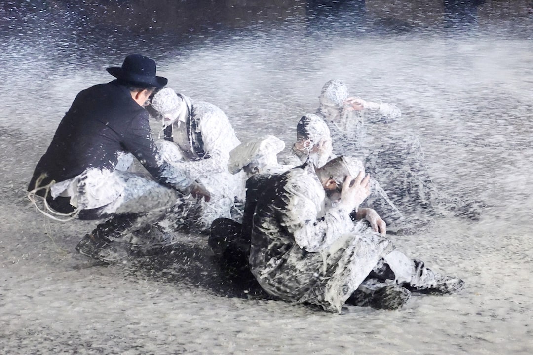 这些男人举起手来保护他们的脸,看起来几乎像雕像 - 除了一个成功保持在混乱之上的人,他在帮助旁边的男人。喷雾如此强烈,以至于遮住了他们的脸和背景,增强了时间和空间冻结瞬间的印象。