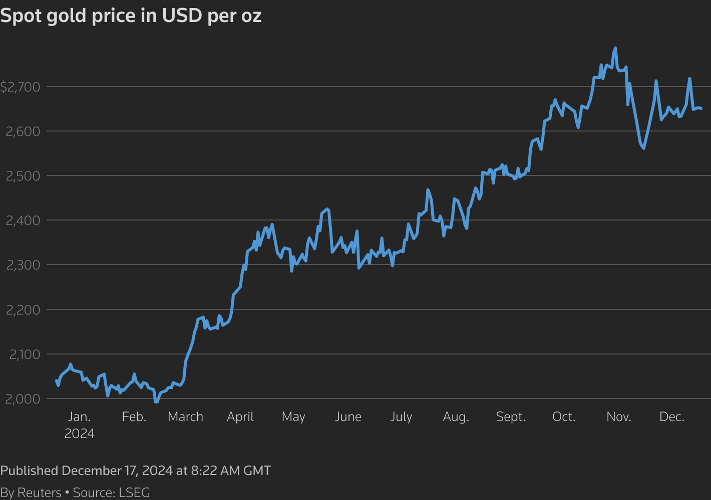一张标题为“每盎司黄金现货价格(美元)”的折线图,跟踪该指标随时间的变化。