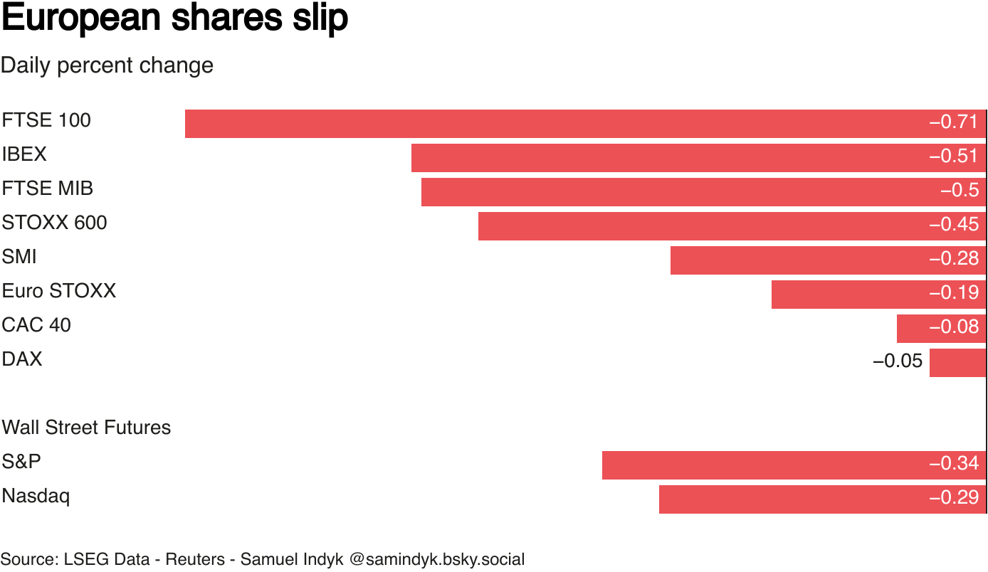 * 泛欧指数STOXX 600 (.STOXX) 下跌0.5%,创下两周以来的最低点。德国DAX (.GDAXI)、法国CAC 40 (.FCHI) 和英国FTSE 100 下跌幅度在0.1%到0.7%之间。* “在欧洲没有太多可以依靠的东西,”丹斯克银行首席投资策略师拉斯·斯科夫高德表示。“圣诞老人肯定会给美国股票投资者带来礼物,但似乎他至少现在是在欧洲的天空上骑行。”