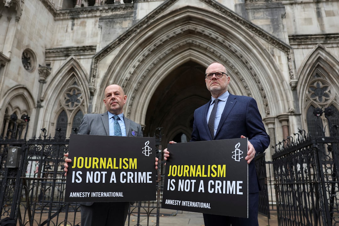 三项调查记者特雷弗·伯尼和巴里·麦卡弗里在皇家司法法院外举着标语,他们的案件将在调查权力法庭上听取调查这对记者的警方证据,地点在英国伦敦,2024年10月1日。路透社/伊莎贝尔·因凡特斯/档案