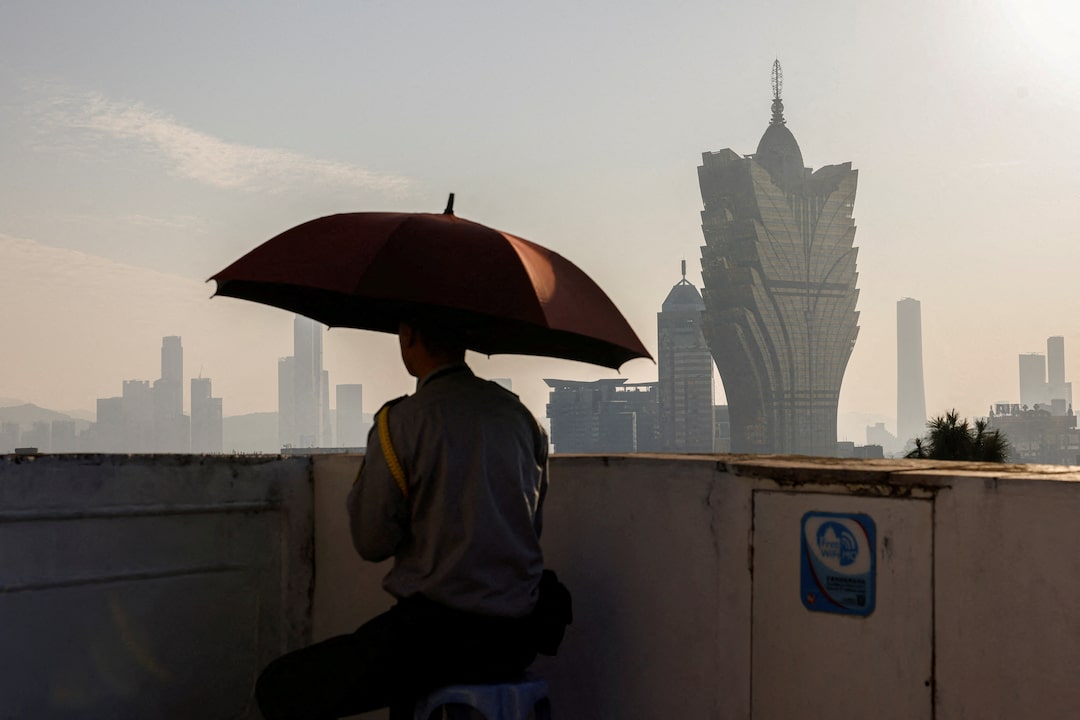 第1项,共5项 一名保安坐在中国澳门的葡京赌场前,该赌场由新濠国际控股运营,时间为2024年12月17日。路透社/泰隆·萧