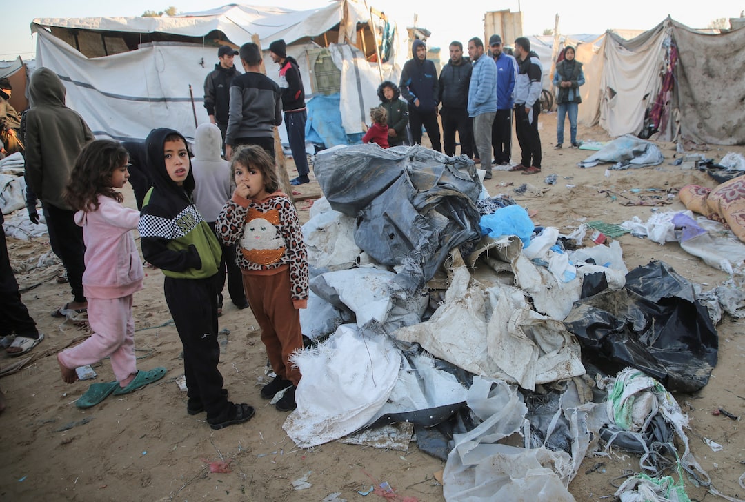 第1项,共5项 一名巴勒斯坦男孩在以色列空袭后,站在一个收容流离失所者的帐篷营地中,位于加沙地带南部的哈农尤尼斯的阿尔马瓦西地区,2024年12月18日。路透社/哈特姆·哈立德