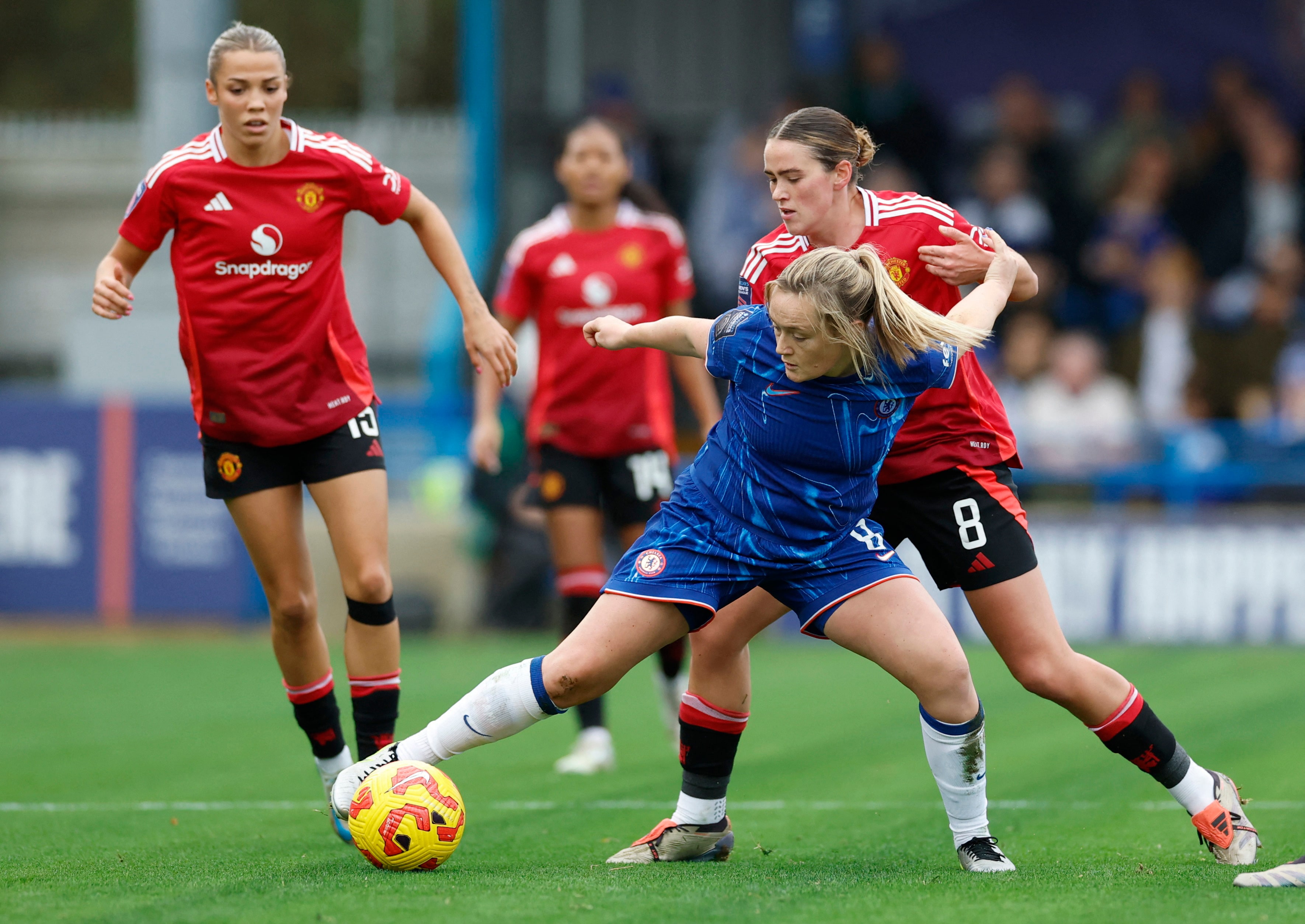 足球 - 女子超级联赛 - 切尔西对曼联 - 金斯梅多,伦敦,英国 - 2024年11月24日。曼联的格雷斯·克林顿与切尔西的艾琳·卡斯伯特在比赛中。通过路透社的行动图片/彼得·齐博拉 伦敦,12月18日(路透社快讯) - 最优秀的运动员知道,单靠蛮力并不总是正确的策略。沙特阿拉伯的体育投资者在2025年可以从中学习,通过投资于女性足球和橄榄球等潜力更大的项目,而不是仅仅关注那些资金雄厚的项目。