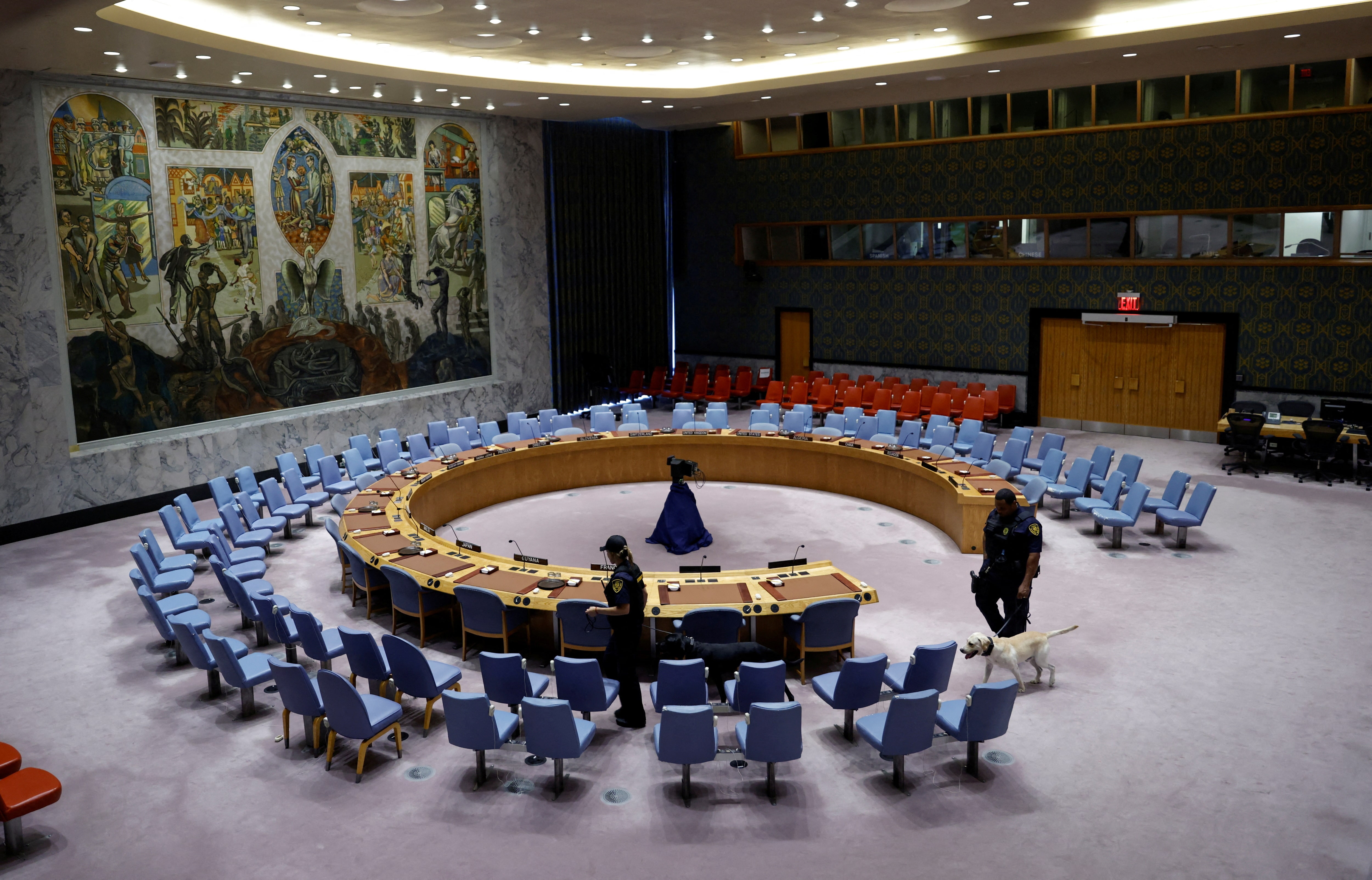 安全人员带着嗅探犬在联合国总部检查安理会会议厅,以便在2024年8月13日讨论以色列与哈马斯在加沙的冲突,地点位于美国纽约市。路透社/爱德华多·穆尼奥斯/档案照片联合国,12月18日(路透社)- 一名在加沙地带被巴勒斯坦激进分子哈马斯扣为人质的以色列男子的兄弟周三批评联合国安理会的不作为,并呼吁其“发出一个响亮的信息,表明恐怖主义永远不会胜利。”