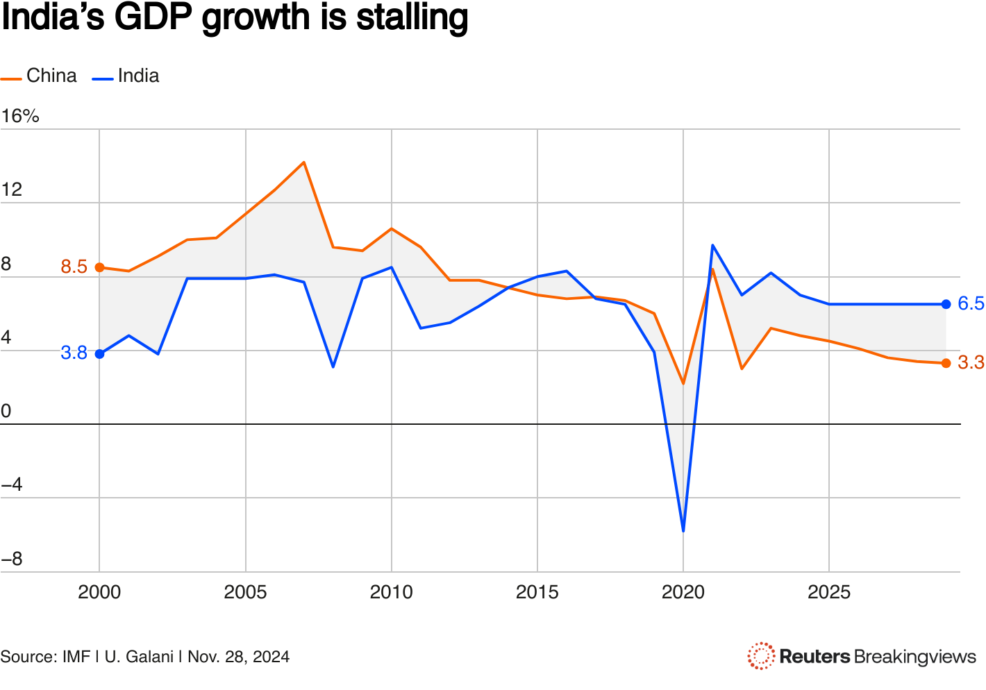 第一个问题的相似之处是印度4万亿美元经济体的轨迹。它突然未能达到预期:GDP增长下降至9月底的三个月内为5.4%,是七个季度以来最慢的增速,仅比中国在可比时期的增速快80个基点。这表明,莫迪总理政府内部对印度将在未来十年实现持续6%-8%的年GDP增长的信念存在重大潜在弱点。与中国一样,支撑私人消费疲软的国内问题——在印度的情况下,包括微弱的工资增长——似乎根深蒂固,难以解决。更重要的是,两国经济都面临严重的外部逆风。美国当选总统唐纳德·特朗普威胁对南亚国家征收与他对中华人民共和国威胁的同样大的贸易关税。同时,印度首富戈塔姆·阿达尼在美国因证券欺诈被起诉后,可能会抑制他的增长雄心,他对此表示否认。