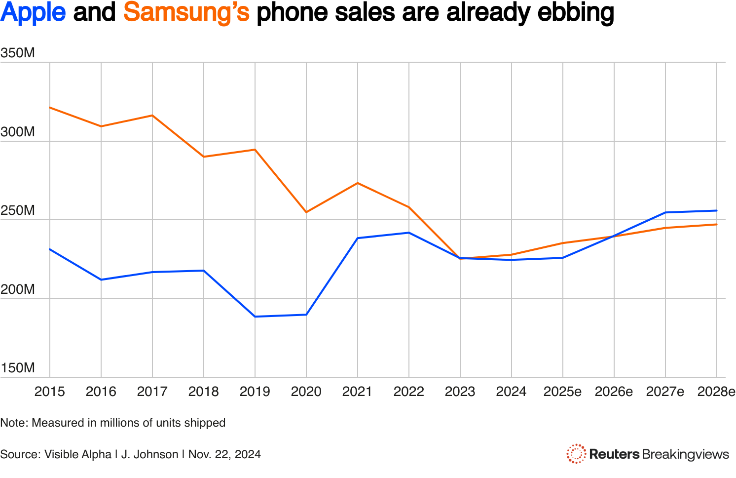 但随着对在线安全担忧的日益加剧,这些数字可能会进一步增加。根据伦敦经济学院的研究人员的说法,七个国家中就有一个最近出台了限制或防止学生在学校使用智能手机的政策,还有更多国家正在考虑类似的措施。澳大利亚政府最近通过了一项法律,规定社交媒体用户必须年满16岁。10月份,33个美国州对Facebook和Instagram的母公司Meta(META.O)提起诉讼,指控其助长了年轻人的心理健康危机。这对像三星和苹果这样的公司构成了更长期的挑战——后者的年收入超过一半来自iPhone。来自中国小米等竞争对手的竞争正在减缓销售增长。如果一批新的手机用户对其产品对心理健康的影响感到担忧,他们可能永远不会购买。