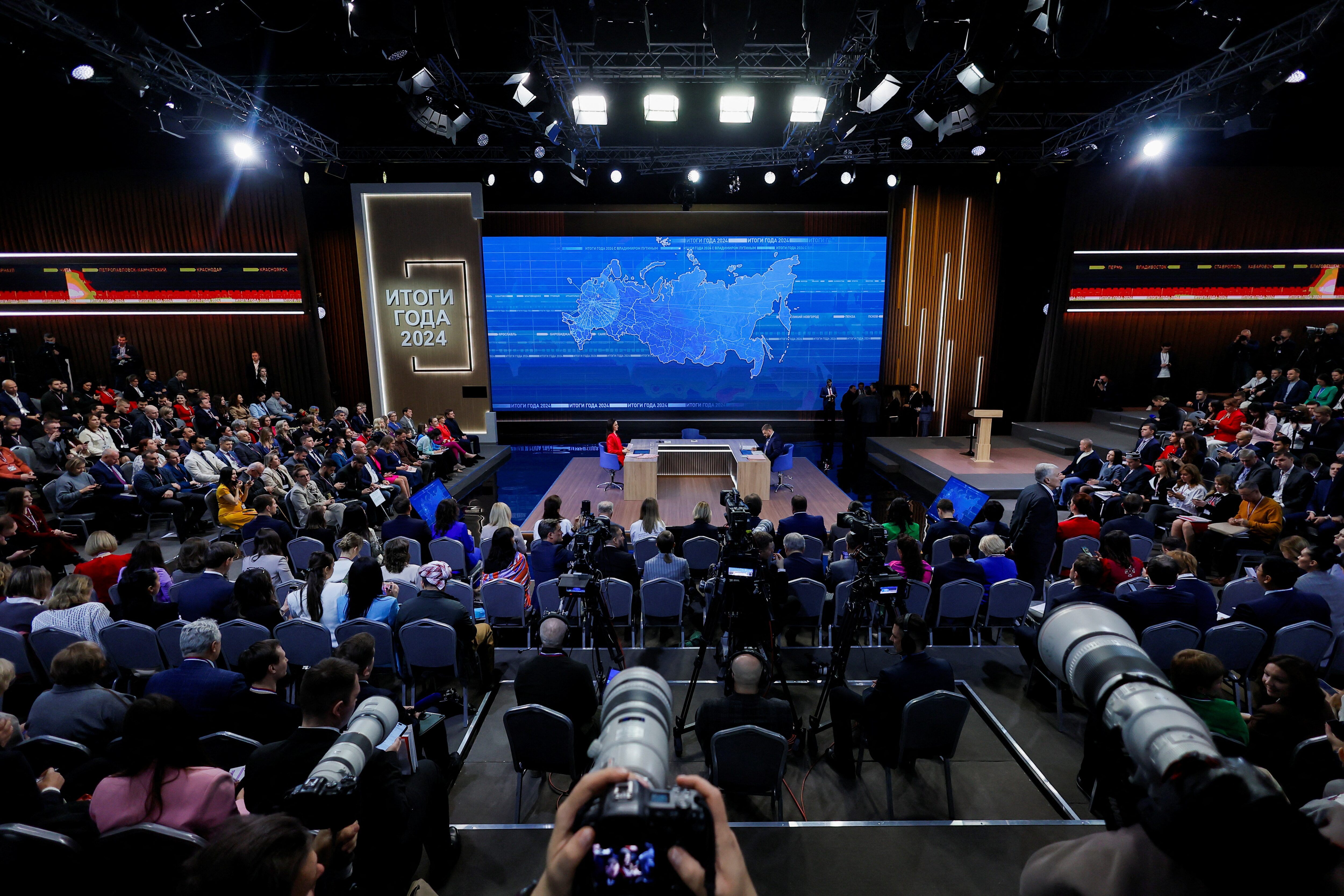 与会者在俄罗斯总统弗拉基米尔·普京的年度新闻发布会当天于俄罗斯莫斯科召开。2024年12月19日。路透社/马克西姆·谢梅托夫莫斯科,12月19日(路透社) - 俄罗斯总统弗拉基米尔·普京周四建议与美国进行一次“导弹决斗”,以证明新的俄罗斯高超音速弹道导弹Oreshnik如何能够击败任何美国反导系统。
