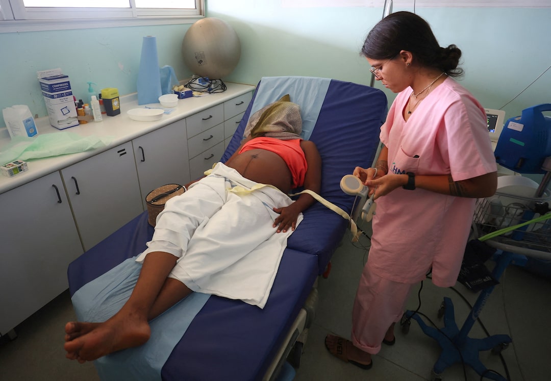 第1项,共4项 法国助产士露西·杰拉尔,26岁,在卡哈尼的产科病房照顾一名孕妇,地点位于法国马约特,时间为2024年12月19日,飓风奇多过后。路透社/伊夫·赫尔曼