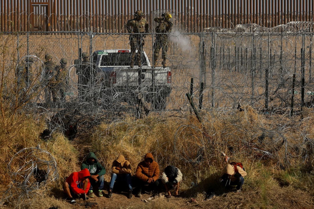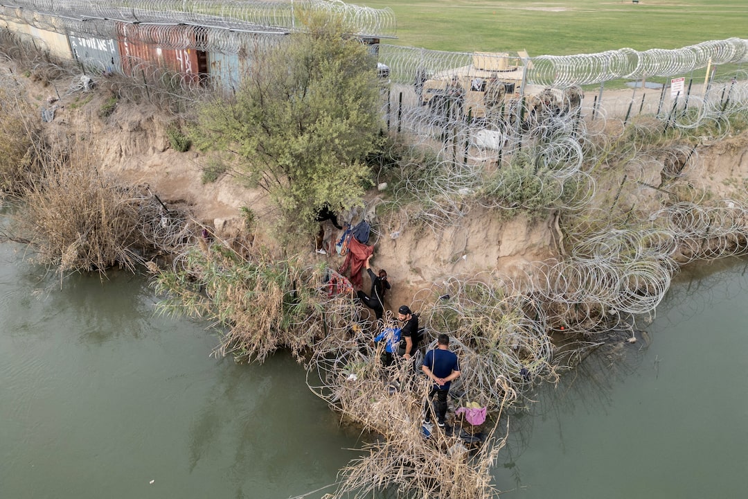 三项中的第一项 一群移民试图穿过位于美国德克萨斯州伊agle Pass的里约格兰德河岸的铁丝网围栏,另一侧是美国国民警卫队的成员在警戒,2024年2月27日。路透社/高中村文件照片