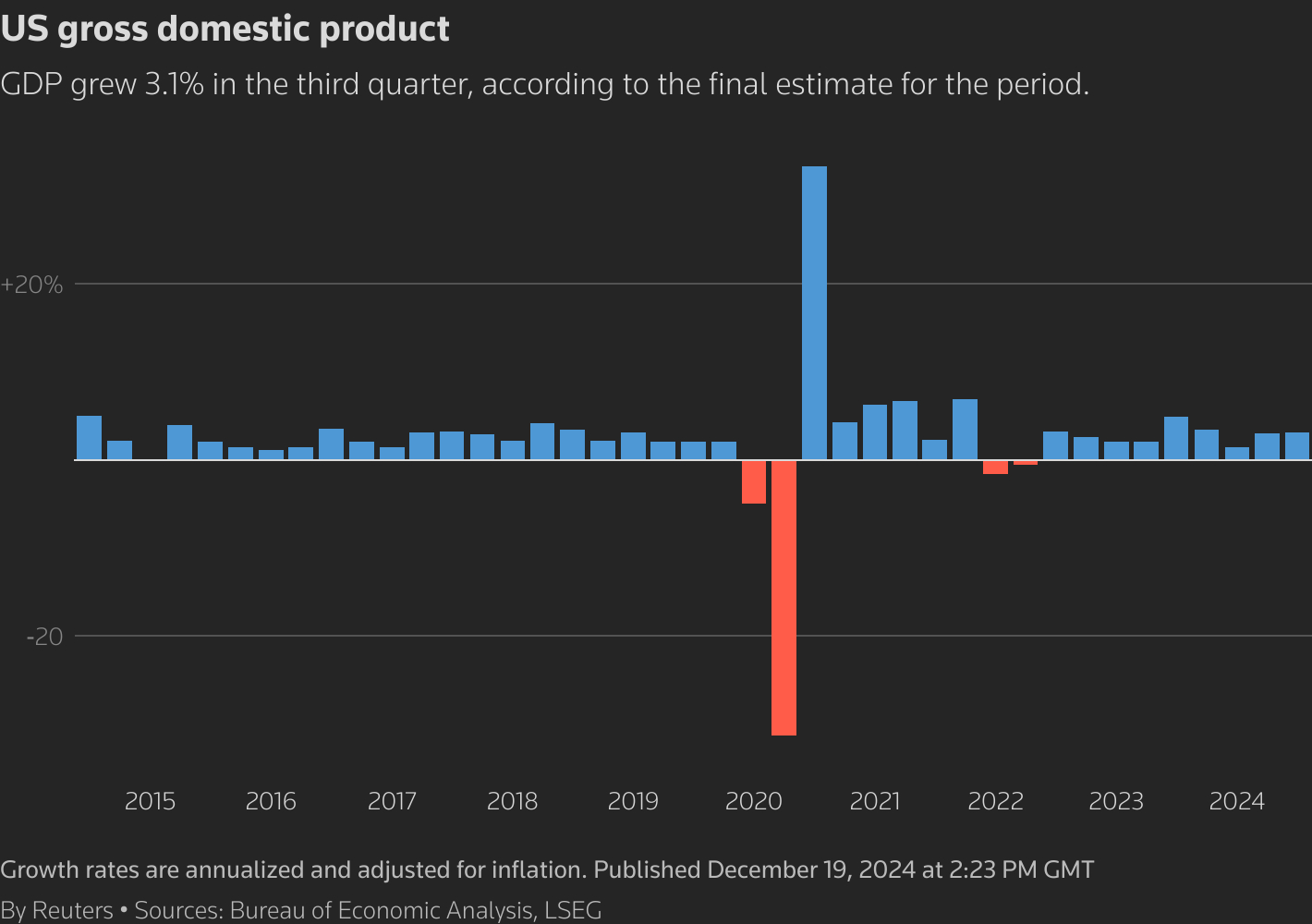 一张标题为“美国国内生产总值”的柱状图,跟踪过去一年的指标。根据该时期的最终估计,第三季度GDP增长了3.1%。